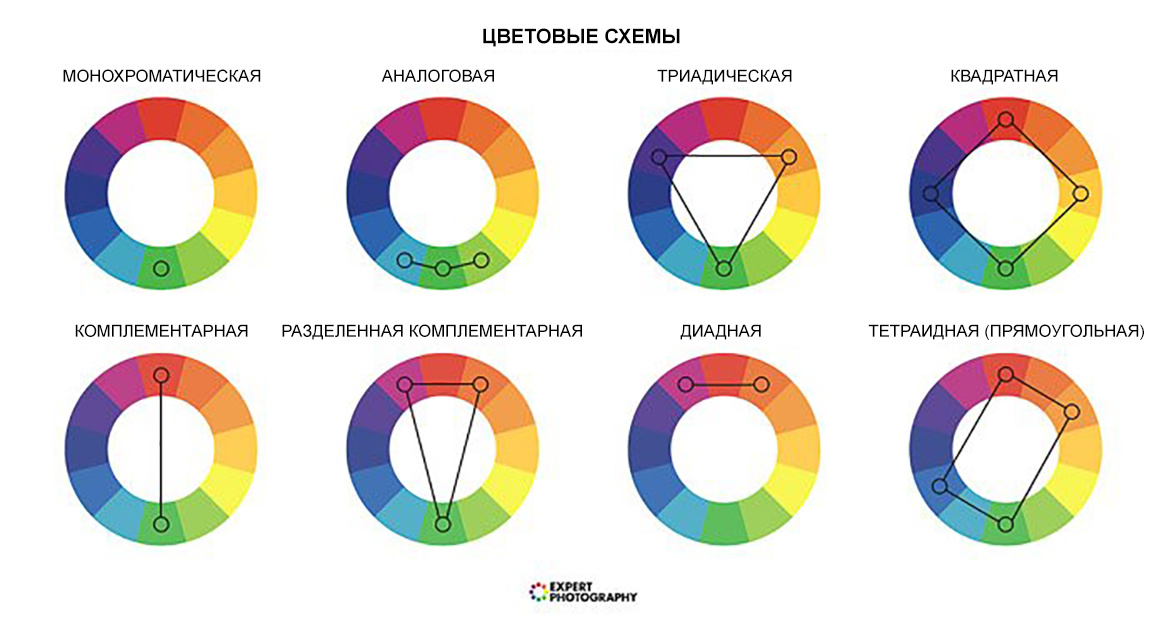 Цветовой круг — это круговая схема, которая визуально представляет взаимосвязь между цветами. Она представляет собой последовательность чистых оттенков. Здесь показаны наиболее распространённые типы цветовых сочетаний: