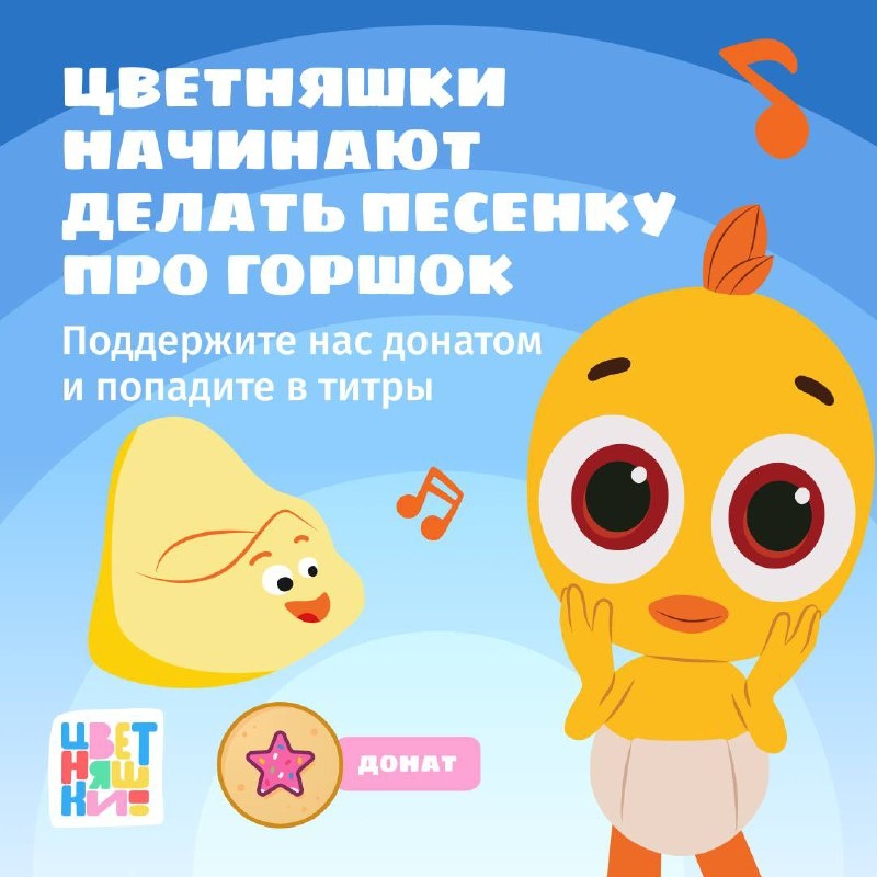 Сегодня мы поделились новостью: команда Цветняшек начала работу над новой песенкой про горшок!🙂 И поскольку именно вы, наши зрители, предложили поднять эту тему в Цветняшках, мы уверены, что многим захочется поучаствовать в создании этой песни🎵 У вас есть возможность попасть в титры будущего видео — просто поддержите нашу цель «Создание песенки про горшок от Цветняшек» в VK Donut! Совсем недавно зрители уже увидели свои имена в титрах новогодней песенки «В лесу родилась Ёлочка». Это вызвало много тёплых откликов, поэтому мы решили продолжить такую традицию❤️