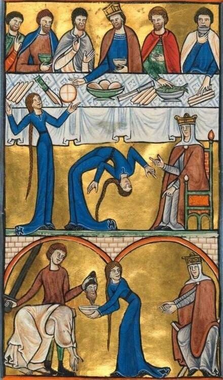 На первый взгляд кажется, что перед нами — какой-то странный комикс про тусовку, которая закончилась поножовщиной. Мужчина вон головы лишился! Криминальная хроника? Нет, всего лишь Новый Завет. Перед нами — печальная история Иоанна Крестителя. Как мы знаем, он был пророком и предтечей Христа, и его тоже постигла тяжелая участь. Иоанн публично осудил царицу Иродиаду, вступившую в противозаконную связь с братом своего мужа, Иродом Антипой. Дочь Иродиады, юная Саломея, однажды во время пира танцевала перед гостями, и так впечатлила Антипу, что он даровал ей исполнение любого желания. Тогда по наущению матери Саломея "заказала" бедного Иоанна, и он лишился головы. Кроме сюжета очень примечательна и сама книга, к которой принадлежит иллюстрация. Она называется "Золотой Мюнхенский Псалтырь", потому что все изображения в ней сделаны на вот таком золотом фоне. Книга включает в себя около 90 сцен из Старого и Нового заветов. Этот шедевр средневековой иллюминации был создан в начале XIII век