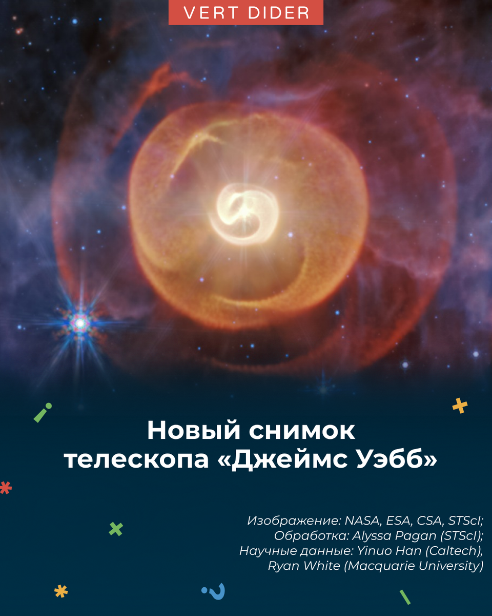 🔭 Космический телескоп «Джеймс Уэбб» получил ещё одно красивое и важное для учёных изображение. На снимке четыре змеевидных пылевых оболочки, вложенные друг в друга. Это первое чёткое изображение в инфракрасном диапазоне, где видны все четыре спирали, ранее удавалось «увидеть» только одну. Эти оболочки сформировались за последние 700 лет вокруг двух стареющих звёзд Вольфа-Райе в системе Апоп. Эти сверхмассивные быстровращающиеся горячие звёзды очень высокой светимости испускают сильный звёздный ветер. Когда они оказываются близко друг к другу, то выбрасывают в космос большое количество богатой углеродом пыли. Система Апоп — единственный известный астрономам случай, когда обе звезды в ней принадлежат к типу Вольфа-Райе. Судя по данным «Джеймса Уэбба» и результатам восьми лет наблюдений очень большого телескопа ESO, раз в 190 лет звёзды проходят близко друг к другу. Их звёздные ветры сталкиваются и за 25 лет создают плотные облака пыли, которые разлетаются со скоростью до 3000 км/с. С