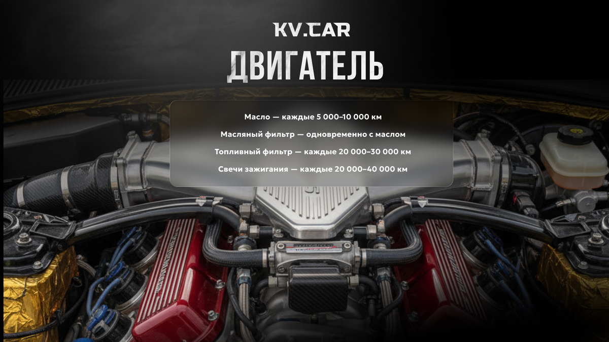 Для стабильной и беспроблемной службы автомобиля важно регулярно проверять состояние ключевых узлов и вовремя менять расходники. Ниже — структурированные блоки, которые можно использовать как основу для поста-карусели. Двигатель Регулярная замена расходников в двигателе помогает поддерживать стабильную работу и уменьшает риск поломок. Что нужно менять: Масло — каждые 5 000–10 000 км Масляный фильтр — вместе с маслом Воздушный фильтр — каждые 10 000–20 000 км Топливный фильтр — каждые 20 000–30 000 км Свечи зажигания — каждые 20 000–40 000 км Трансмиссия и тормоза Эти системы напрямую влияют на безопасность, поэтому важно следить за их состоянием и не пропускать регламентные работы. Периодичность обслуживания: Масло в коробке передач — каждые 60 000–100 000 км Масляный фильтр коробки — при замене масла Тормозные колодки — проверка каждые 10 000 км Тормозные диски — проверка при каждом осмотре Тормозная жидкость — каждые 2 года или 40 000 км Ходовая часть и прочие элементы Ходовая част