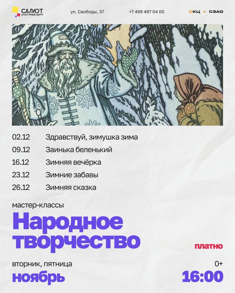 ❄️ Мастер-классы «Народное творчество» в КЦ «Салют» Декабрь — время тёплых встреч, уютных традиций и настоящего волшебства. Приглашаем детей и взрослых на серию зимних мастер-классов, где каждый сможет прикоснуться к народной культуре и создать что-то своими руками! ✨ 📅 Расписание мастер-классов: • 2 декабря — «Здравствуй, зимушка-зима» • 9 декабря — «Заинька беленький» • 16 декабря — «Зимняя вечёрка» • 23 декабря — «Зимние забавы» • 26 декабря — «Зимняя сказка» Каждая встреча — это атмосфера творчества, добрых эмоций и новых открытий. Отличный способ провести время всей семьёй и зарядиться праздничным настроением ❄️✨ 📞 Регистрация: +7 (926) 382-95-14 Ждём вас в КЦ «Салют»! 🎄💫 #мастерклассы #народноетворчество #зима2025 #кцсалют #творчество #детиимы #семейныйдосуг #зимниепраздники