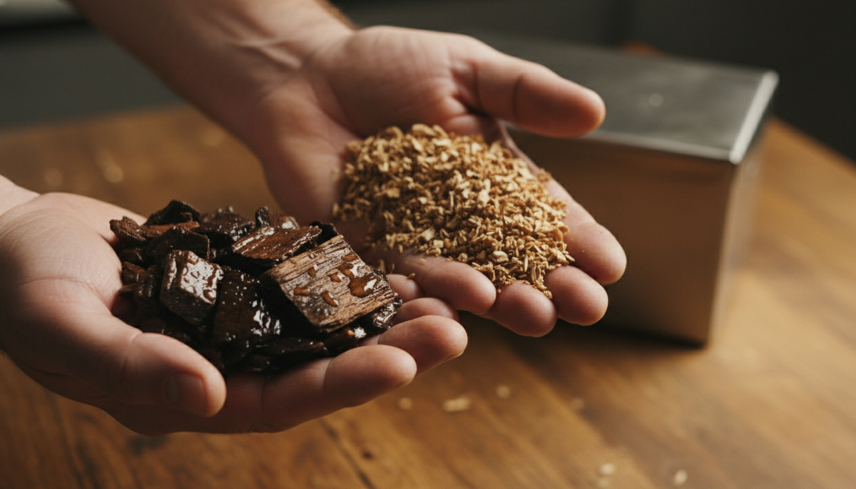 Если щепа слишком мокрая — дым превращается в пар, вкус продуктов может посветлеть кислинкой или горечью. Пересушенная щепа даёт риск ярких вспышек и резкого, горяче‑горького дыма. Щепа с плесенью или следами лака — категорически не для еды.