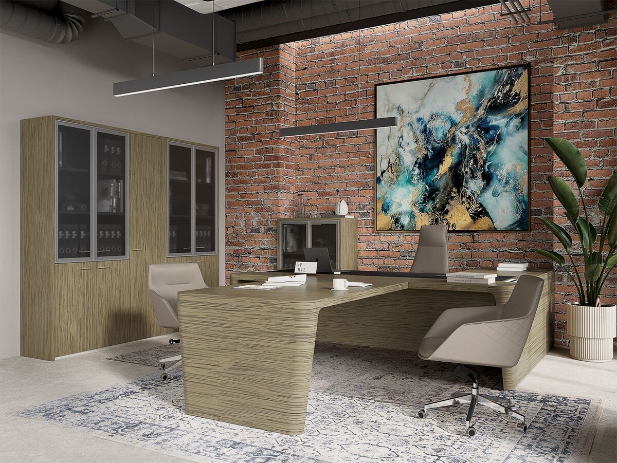 Производитель: Россия, Юнитекс Серия мебели Премиум сочетает статусность и функциональность в каждой детали. Это продуманное решение для обустройства кабинета руководителя, сочетающее: премиальные материалы и качественную отделку; эргономичную конструкцию с вниманием к деталям; современный дизайн, подчёркивающий статус владельца. Стоимость комплекта: от 795 818 ₽. Состав комплекта и цены: Тумба выкатная, (Ш × Г × В): 45×58×62 см, 116 330 ₽ Стол руководителя с фронтальной панелью, (Ш × Г × В): 190×100×76 см, 679 488 ₽ Материалы: Столешницы, топы шкафов, фасадные элементы шкафов и тумб: плита МДФ, облицованная шпоном с текстурой эбенового дерева, с лакокрасочным покрытием. Корпуса шкафов, внутренние детали тумб: ЛДСтП. Тип отделки: Матовая открытопористая отделка европейскими лакокрасочными материалами. Два варианта декора: «ЭБЕН ТЕМНЫЙ» — глубокий, насыщенный оттенок, подчёркивающий респектабельность интерьера; «ЭБЕН АРКТИК» — светлый вариант с контрастными акцентами, добавляющий