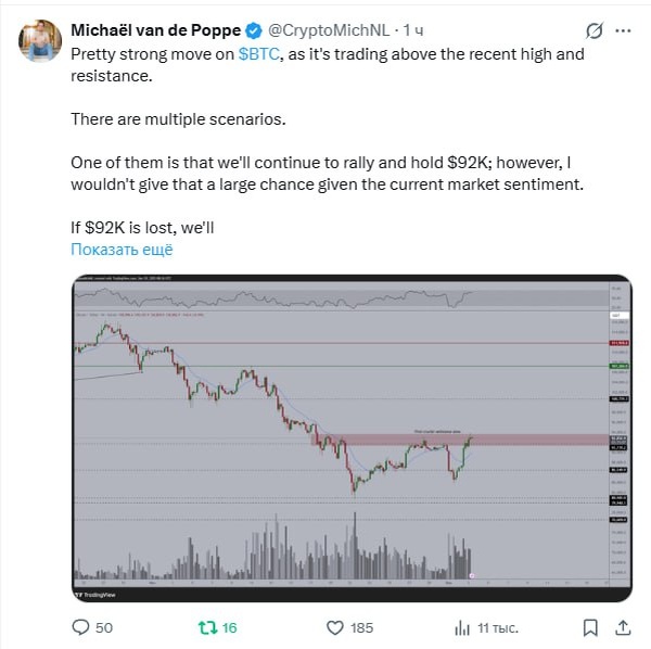 Довольно сильное движение у BTC, поскольку он торгуется выше недавнего максимума и уровня сопротивления. Возможны несколько сценариев. Один из них — продолжение роста и удержание уровня $92 000; однако, учитывая текущие настроения рынка, я не стал бы давать этому высоких шансов. Если уровень $92 000 будет потерян, вероятно, произойдет ликвидация части длинных позиций и относительно резкое падение. В таком случае, если BTC скорректируется до любой цены в диапазоне $88 000 – $90 000, то для тренда это будет приемлемо, так как на младших таймфреймах видны сигналы о восходящем тренде. Я ожидаю тестирования уровня $100 000 и, возможно, $105 000 в течение этого месяца.
