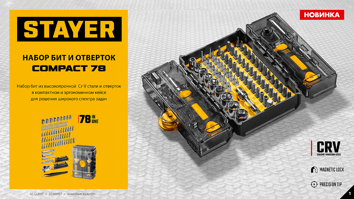 Набор бит из высокопрочной Cr-V стали и отверток в компактном и эргономичном кейсе для решения широкого спектра задач.