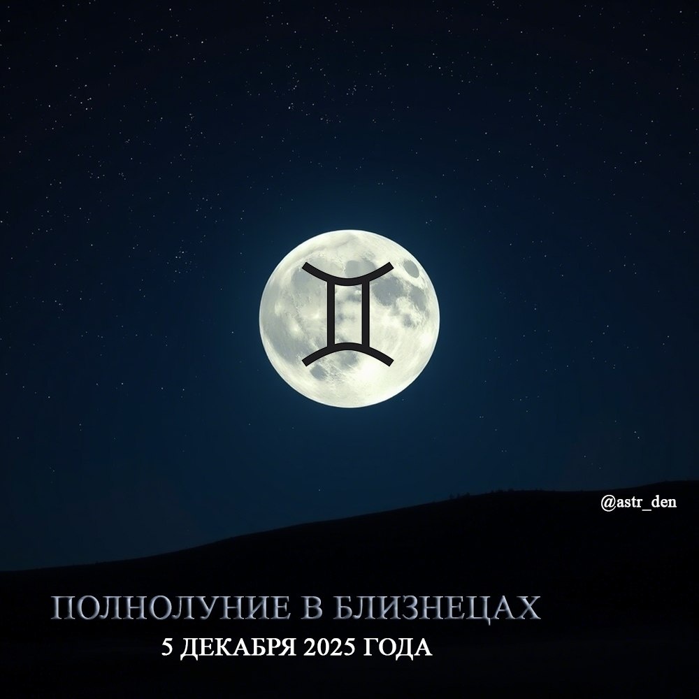 🌕 ПОЛНОЛУНИЕ В БЛИЗНЕЦАХ. 5 ДЕКАБРЯ. Это Полнолуние — кульминация и момент осознания тем, начатых в Новолуние в Стрельце две недели назад (15 ноября). Луна в Близнецах будет стоять в оппозиции к Солнцу и Венере в знаке Стрельца. 🌠 КЛЮЧЕВЫЕ ТЕМЫ И ВОЗМОЖНЫЕ ПРОЯВЛЕНИЯ: 1. Идеалы vs Реальность: Ваши большие планы и философские взгляды могут столкнуться с практическими мелочами, информационным шумом или необходимостью договариваться с соседями/коллегами.· 2. Вера vs Знания: Возможно, вы получите информацию, которая поставит под сомнение ваши убеждения, или вам придется отстаивать свои взгляды в дискуссии. 3. Коммуникационный детонатор: Возможны яркие, но поверхностные споры, всплеск новостей, важные разговоры, которые давно назрели. Будьте осторожны со словами — они могут быть особенно ранящими или двусмысленными. 4. Любовь и ценности: В сфере отношений и финансов это время, когда может стать явной разница в ценностях или жизненных устремлениях между вами и партнером. Либо, наоборот,