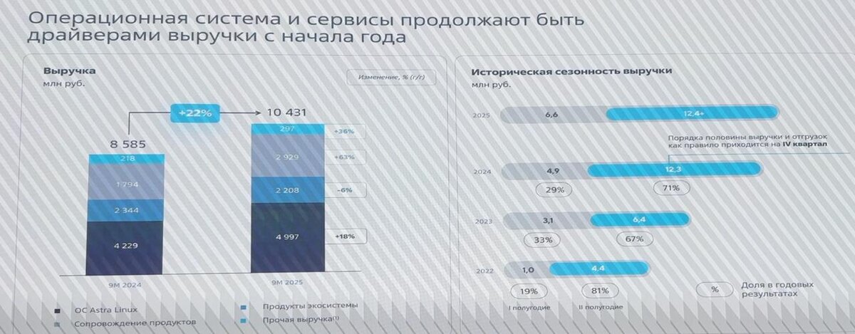 Группа Астра объявила неаудированные финансовые результаты за 9 месяцев 2025 года Отгрузки за 9 месяцев 2025 года составили 9,7 млрд рублей, выручка увеличилась на 22% и составила 10,4 млрд рублей Скорректированная EBITDA достигла 2,2 млрд рублей, скорректированная чистая прибыль - 1,0 млрд рублей === Показатели не самые хорошие, НО!!! Во-первых я там был, большое спасибо за приглашение, во-вторых, многие СМИ что я читал по этому поводу "забывают" дорасказать о сезонности На слайде сами смотрите: на IV квартал года, традиционно, приходится 70% выручки, а отчет про первые 3 квартала, т.е. только ~30% продаж прошло и отметилось в отчете Но это не отменяет тот факт, что большинство заказчиков у всех, не только у Астры, отменяют, переносят на 2026 год, "сокращают" бюджеты контрактов И плохо всем, в экономике плохо, а Астра просто публичная компания и обязана делиться отчетами, в отличии от всех остальных, кому может быть намного хуже Кстати, я в новостной взял очень интересную мыс