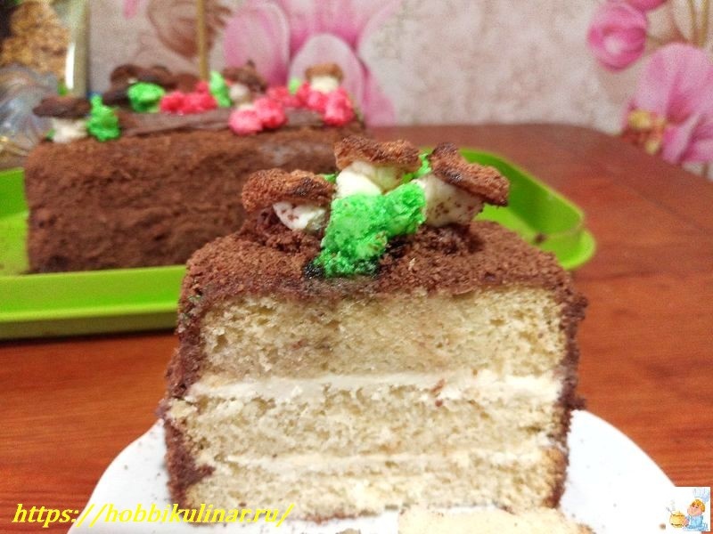 Украшайте по своему усмотрению, но я помню, что часто на таком торте были грибочки и лесная поляна, что-то напоминающее сказку. Возможно, отсюда и загадочное его название «Сказка».