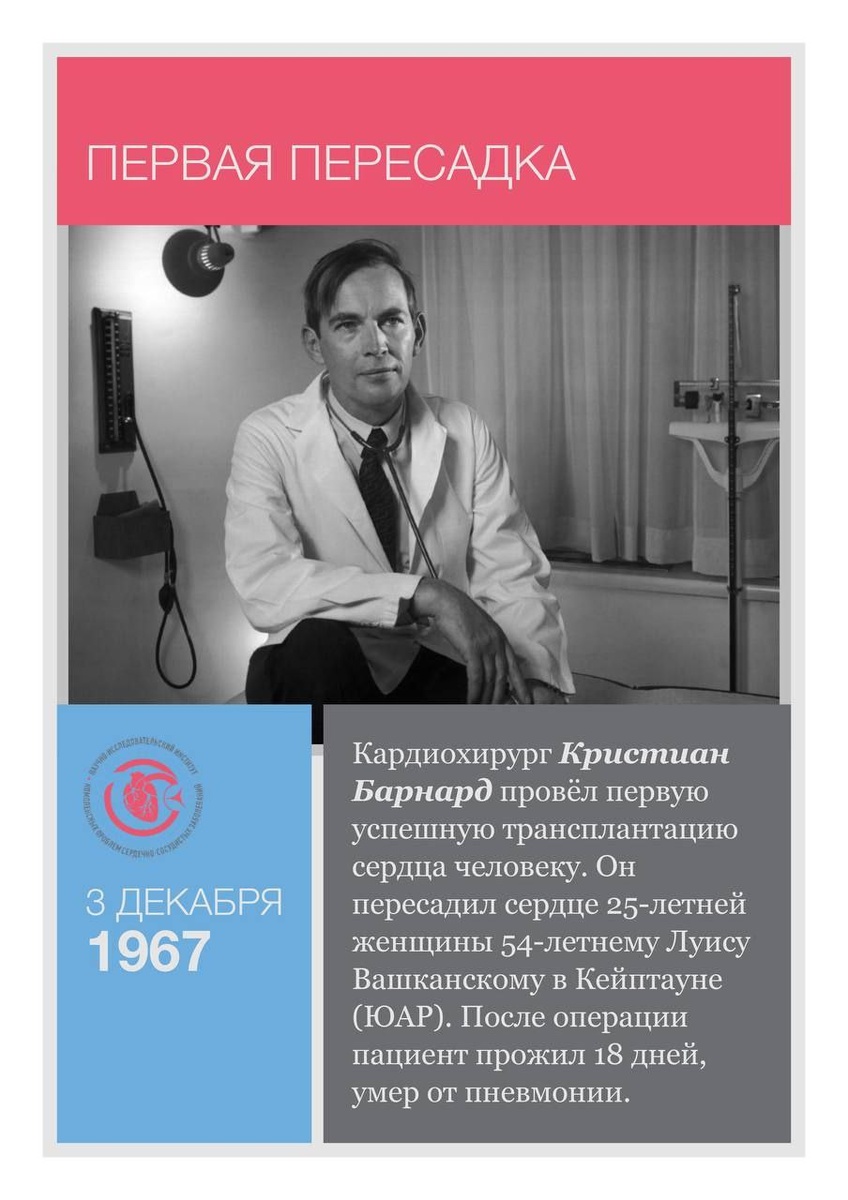 🫀🗓️ 3 декабря 1967 года впервые в мировой истории человеку успешно пересадили сердце В карточках рассказываем, как развивалась наука трансплантации сердца и какой вклад в её становление внесли советские учёные — в том числе «отец» кардиохирургии Кузбасса Леонид Барбараш. #ДатыИменаСобытия 🫀 Будьте здоровы и читайте соцсети НИИ КПССЗ | Подписаться