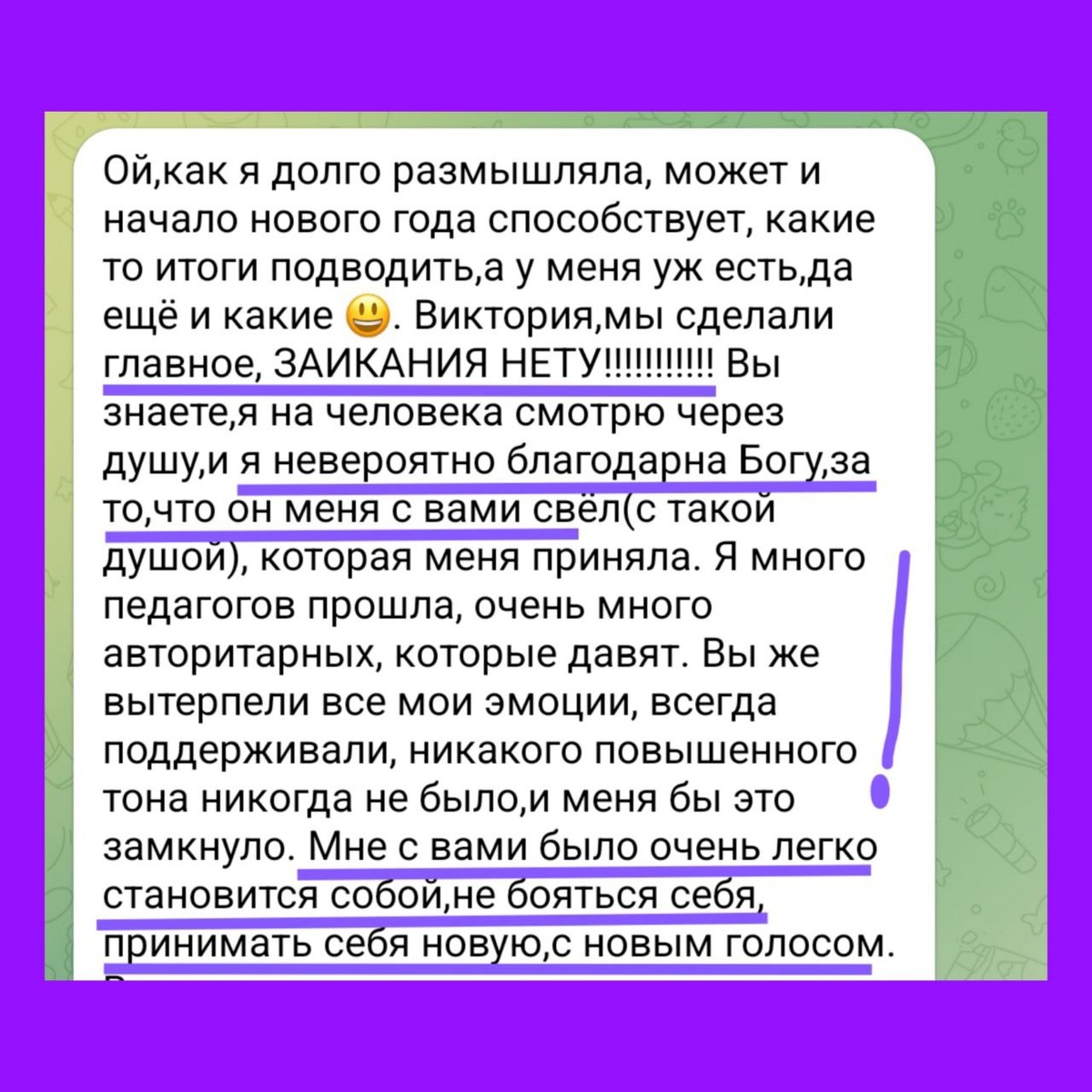 ЗАИКАНИЯ НЕТУ!!!!!!! - написала мне моя ученица из Баку. Всего два слова, но слезы счастья сдержать невозможно 🥹 Иногда один вот такой отзыв объясняет суть работы лучше, чем десятки методичек. Поэтому сегодня расскажу, почему результат получается там, где есть безопасность. В августе 2023 ко мне пришла удивительная девушка. У неё был опыт общения с авторитарными педагогами, которые давили и ставили жёсткие рамки. Она почти не верила, что можно иначе. 💜💜💜💜💜 Заикание - штука сложная. Тут нужно докопаться до корня, а не просто "ставить звуки". У всех это происходит по-разному: например, у Владислава ушло за 6 занятий, а здесь мы шли не один год. И каждый такой путь уникален, нет одинакового решения. Вы же вытерпели все мои эмоции, всегда поддерживали, никакого повышенного тона никогда не было, и меня бы это замкнуло. Мне с вами было очень легко становиться собой, не бояться себя, принимать себя новую. В этом моя философия работы. Заикание, спазмы, страх речи - это часто след