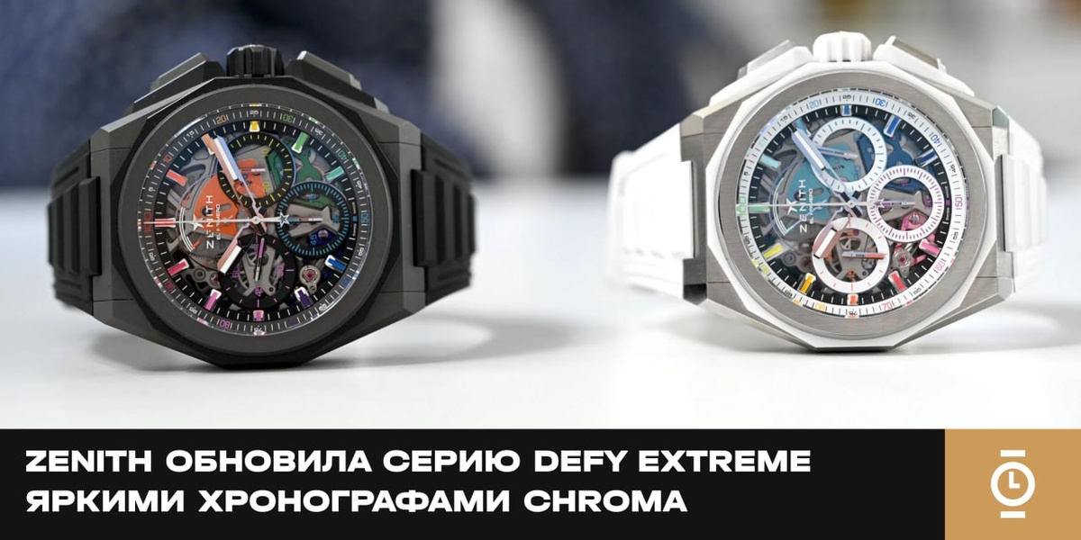 ZENITH ОБНОВИЛА СЕРИЮ DEFY EXTREME ЯРКИМИ ХРОНОГРАФАМИ CHROMA #новости_WD Zenith расширила линейку Defy Extreme двумя лимитированными моделями Chroma, развивая концепцию, впервые появившуюся в 2022 году. Новинки подчёркивают сочетание высокой частоты, мощной архитектуры корпуса и яркой цветовой эстетики. Корпус диаметром 45 мм выполнен либо из микропескоструйного титана с чёрными элементами, либо из сатинированного титана в сочетании с белой керамикой, используемой для безеля, заводной головки и накладок кнопок. Двенадцатигранный безель и резкие грани корпуса формируют характерный экстремальный стиль, а лёгкие материалы обеспечивают высокий комфорт. Водозащита остаётся на уровне 200 метров. Скелетонизированный циферблат раскрывает архитектуру калибра El Primero 9004, мосты которого покрыты радужным PVD. Родированные индексы заполнены лаком с плавным градиентом, создающим эффект цветового свечения, а родированные стрелки покрыты Super-LumiNova. Центральная секундная стрелка хроногра