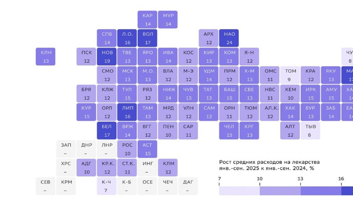 Средние расходы россиян в месяц на лекарства и медицинские товары за год выросли на 13% и достигли 2580 рублей. При этом, как показало исследование Сбер Индекса, доля затрат на такие товары составила только 3% от общего объёма потребления. Житель Москвы в месяц тратит на лекарства и медицинские товары в среднем 3480 рублей. Наибольшие расходы на эту категорию товаров зафиксированы в Чукотском автономном округе — 3940 рублей (+8% за год), меньше всего тратят в Тыве — 1780 рублей (+8% за год). Больше всего за год выросли траты на лекарства в Ненецком автономном округе — на 24% в номинальном выражении (до 2980 рублей), Новгородской области — на 19% (до 2320 рублей) и Белгородской области — на 17% (до 2470 рублей). Наименьший прирост зафиксирован в Приморском крае — 6,8% (до 2900 рублей) и Карачаево-Черкесии — 6,9% (до 2480 рублей). Максимальные траты на эту категорию товаров отмечены у людей старше 50 лет: средний чек — 900 рублей за покупку (+11% за год), а ежемесячные расходы — 2900 руб