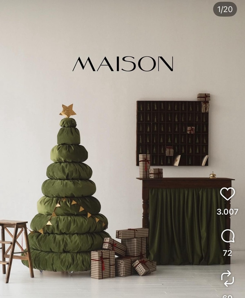Признайтесь: в глубине души вы тоже устали от одинаковых новогодних ёлок. От этих пластиковых, «правильных», нарядно-уставших красавиц с красными шарами, блестящей гирляндой и обязательной звездой, которую почему-то никто не включает. Кажется, что все квартиры страны украшают по одному шаблону, скопированному из каталога 2009 года. А что если в этом году сыграть против правил? Что если отказаться от стандартов и вместо елки поставить в гостиной… башню из подушек? Или сложить из пледов настоящий текстильный арт-объект? Или построить хвою-без-хвои - геометрию, стилизованную под современную скульптуру? Да, это звучит дерзко. Но именно дерзость сегодня и является главным стилем. Когда ёлка становится искусством Белоснежная конструкция из подушек - мягкая, почти эфемерная, похожая на что-то из мира high fashion. Это интерьерный перфоманс, а не сезонный атрибут. Ёлка, собранная из текстиля, напоминает арт-объекты Balenciaga - нарочито небрежные складки, драпировки, тканевые каскад