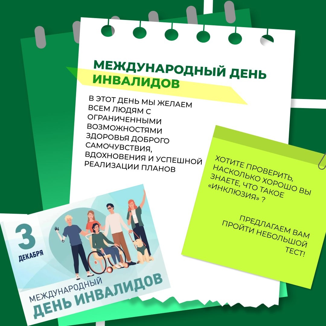 Что такое настоящая инклюзия? 🗓3 декабря во всем мире отмечают Международный день инвалидов. Эта дата нужна, чтобы обратить внимание общества и власти на вопросы, с которыми ежедневно сталкиваются люди с инвалидностью, и напомнить о важности реальной поддержки 🫂 ✨ В этот день мы желаем всем людям с ограниченными возможностями здоровья доброго самочувствия, вдохновения и успешной реализации планов. 🤔 А что на самом деле означает «инклюзия»? Это создание доступной среды, где каждый человек, независимо от своих особенностей, может полноценно участвовать в общественной жизни на равных условиях. Хотите проверить, насколько хорошо вы понимаете этот принцип? Предлагаем вам пройти небольшой тест👇 forms.yandex.ru/u/692dafd9... 👻 МАХ | 📲 ВК | 📝 ДЗЕН