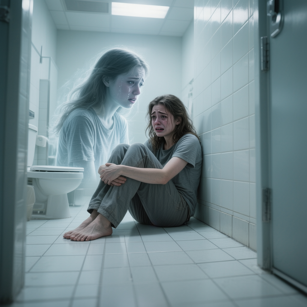 Свет софитов стал её единственной вселенной. Камера медленно приближалась. Эви (Мэйси) прижалась лбом к холодной кафельной стене туалетной кабинки. Её губы шевелились беззвучно. Потом послышался шёпот. Сначала несвязный, потом обретающий форму.