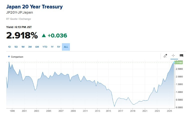 🔸 Доходность 20-летних облигаций Японии подскочила до 2,92%, самого высокого уровня с 1998 года