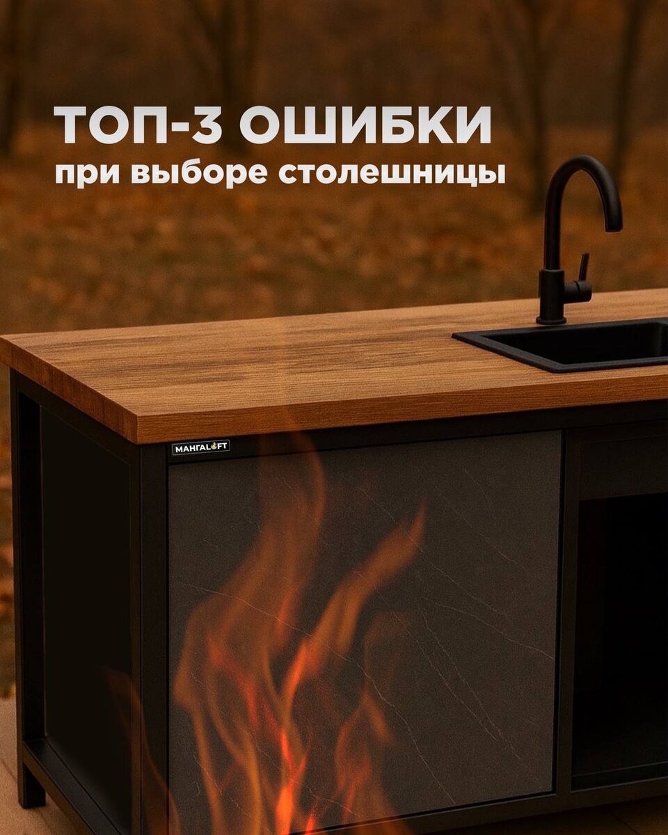 3 ошибки при выборе столешницы для мангальной зоны в беседке 1. Выбор материала, который боится влаги Обычный МДФ, ЛДСП и незащищённые шпоны в беседке быстро начинают: • коробиться • вздуваться по краям • терять геометрию При мангале влажность + жар = ускоренное разрушение. 2. Игнорирование термостойкости Материалы, не рассчитанные на нагрев, дают трещины или желтеют уже через 2–3 сезона. Напишите нам в лс — проконсультируем вас по этому вопросу и поможем выбрать оптимальный материал для вашей столешницы 🫰🏻 3. Неверный размер и расположение рабочей зоны Частая ошибка — брать слишком узкую столешницу (менее 600 мм), либо подгонять модуль “впритык” в беседку. Из-за этого: • неудобно работать • трескаются края от нагрузки • сложно подключать мойку • некуда поставить посуду или блюда Оптимальная глубина: 600 мм. Оптимальная высота: 850–900 мм. Не хотите прогадать с выбором? Напишите нам — ответим на все ваши вопросы по выбору столешницы, а также расскажем про все плюсы и минусы