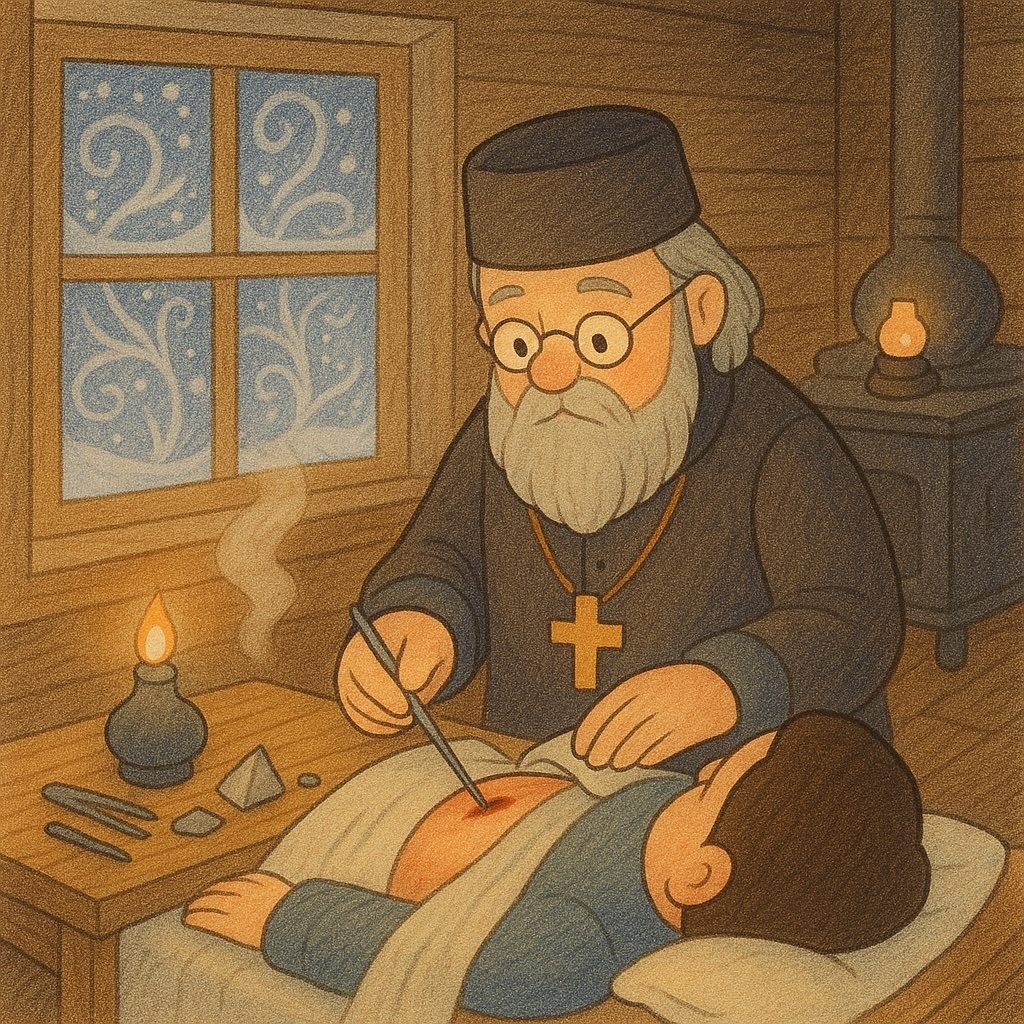 начало ЗДЕСЬ II. В ссылке (1920-1930-е годы) После революции Войно-Ясенецкий стал профессором. Он писал научные книги, в том числе очень нужную «Очерки гнойной хирургии». Такая хирургия лечит раны, которые воспалились и не заживают. Чтобы спасти человека, врач должен знать, как очистить рану и дать ей возможность зажить. В те годы веру в Бога отрицали, священников и верующих часто наказывали. Лука не скрывал, что он священник, поэтому его арестовали. Так начались долгие годы ссылок. Он оказался далеко, в холодных северных краях. Зимой стояли сорокаградусные морозы, окна забивало снегом, в комнате всегда пахло дымом и углём. Настоящих инструментов не было. Лука точил скальпели из стеклянных осколков, делал иглы из проволоки, промывал раны кипячёной водой и солью. Люди приходили к нему тайком: кто-то с больным зубом, кто-то с обмороженными пальцами. Отец Лука никогда не спрашивал, кто перед ним — заключённый или охранник. Просто лечил. Согревая других, сам мёрз, но не жаловался. Говори