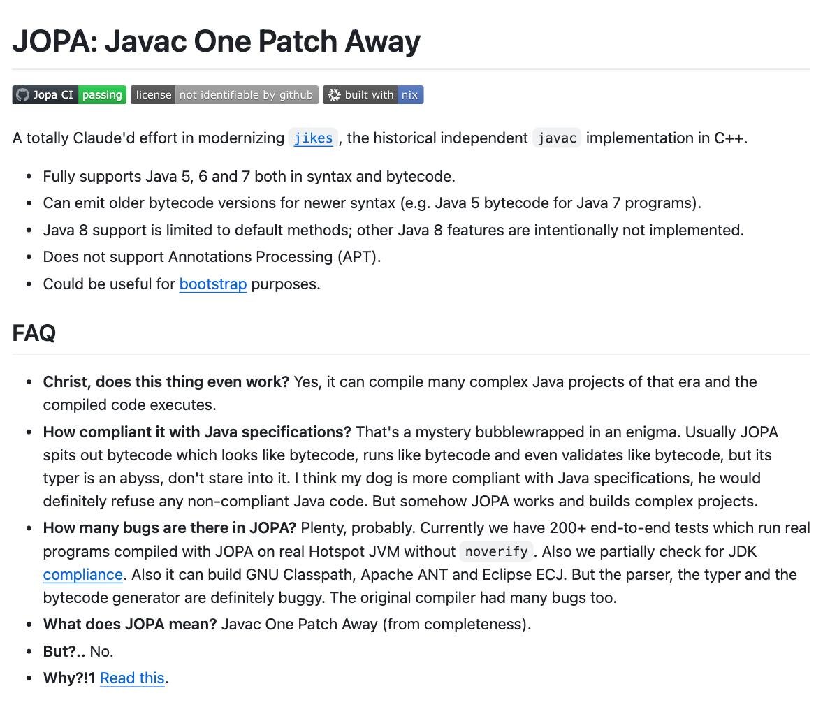 JOPA - новый компилятор Java, переписанный на C++ и основанный на идеях классического jikes. Главное преимущество — полный независимый тулчейн без проприетарных бинарных компонентов. Что можно собрать на базе JOPA: - компилятор на C++; - виртуальную машину JamVM; - GNU Classpath в качестве стандартной библиотеки; - собственные bootstrap-классы, собранные JOPA; - поддержку Java 5, 6 и 7, включая generics, аннотации, try-with-resources и другие ключевые возможности. Решение подойдёт тем, кому важна прозрачность, воспроизводимость и полный контроль над Java-окружением. 🖤 лайк за нейминг ) 🖥 Github: https://github.com/7mind/jopa @javarush