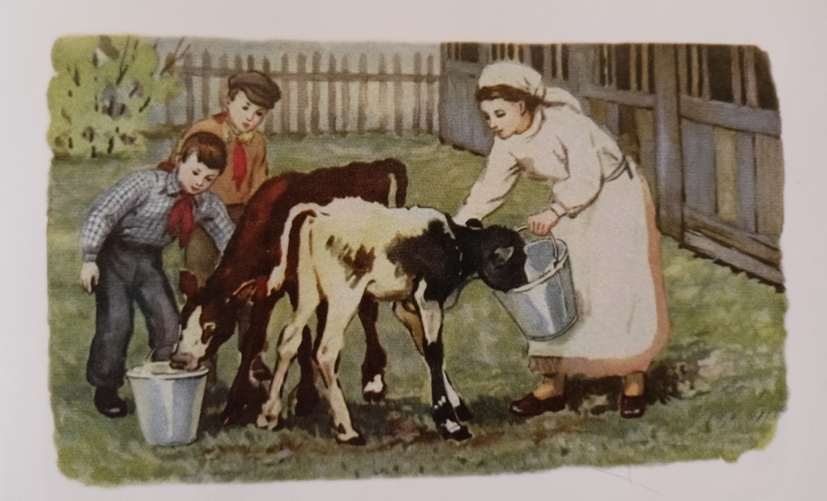1. Проверка домашнего задания. 2. Работа с букварём. На доске напечатаны слоги: ФА ФИ ФО ФЕ ФУ - Какие слоги читаются твёрдо? Какие слоги читаются мягко? Звуки [ф] и [ф'] могут быть твёрдыми и мягкими. Придумайте слова с этими слогами. Отгадайте загадки: По горам, по долгам ходит шуба да кафтан. Это баран или овца. Они дают мех и шерсть, из которых делают одежду. Кто в сарае стоит, жвачку жуёт, молочко даёт? Это корова. Корова - жвачное животное. Они пережёвывают комок травы долго, как жвачку, чтобы трава хорошо измельчилась. Овцы и коровы относятся к домашним или диким животным? - Ребята, как называется хозяйство, на котором содержатся домашние животные? Откройте учебник на стр. 79 и рассмотрите иллюстрацию. Это ферма. Здесь выращивают коров. На картинке вы видите детёнышей коров. Как они называются? - Как называется специалист, который ухаживает за коровами и доит их? - Как вы думаете, что на ферме делают мальчики? Ребята помогают ухаживать за телятами. Давайте прочитаем рассказ.
