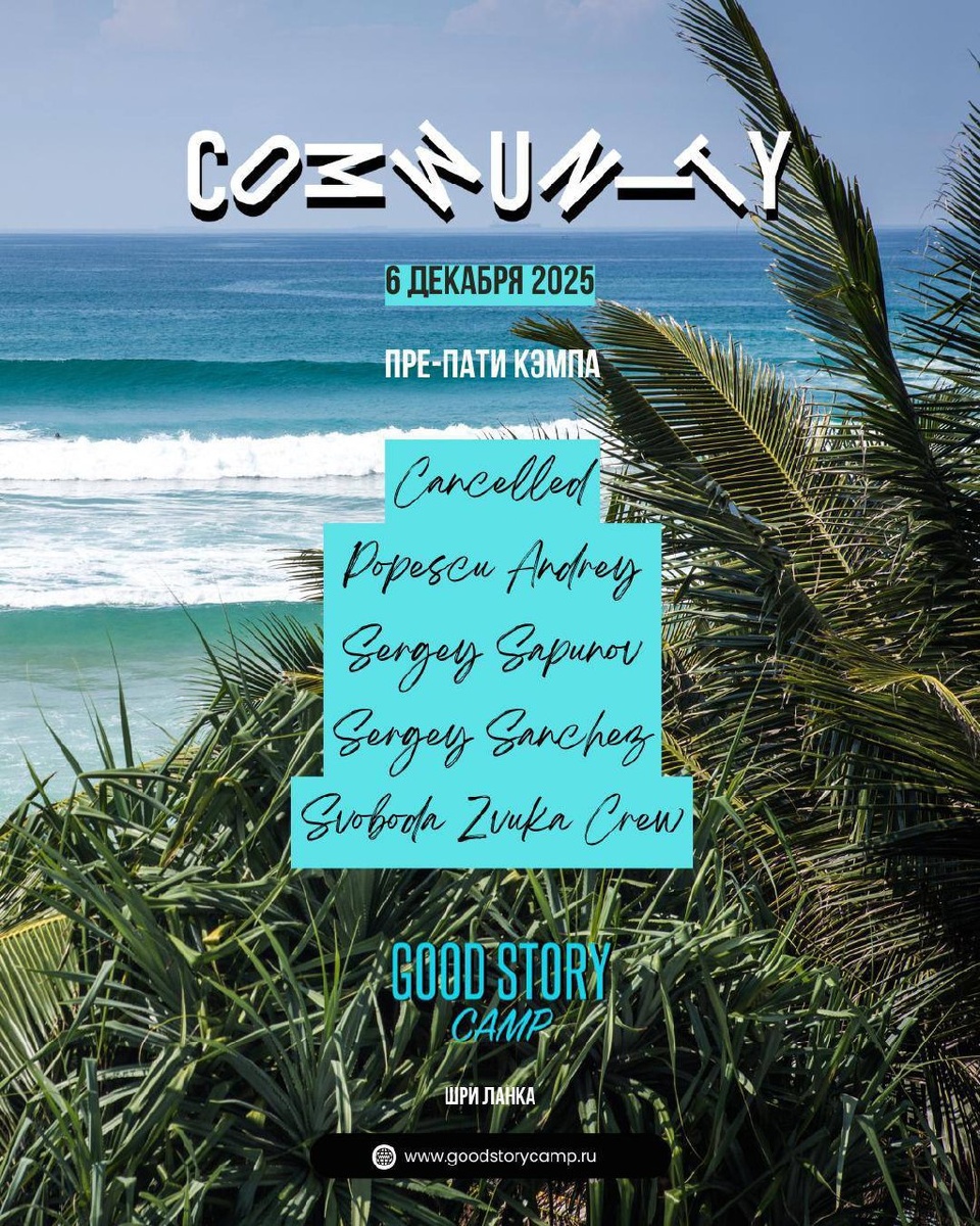 В эту субботу, 6 декабря, команда GOODSTORY CAMP SRI LANKA в COMMUNITY MOSCOW организуют вечеринку! Это будет пре-пати масштабного январского путешествия на остров Шри Ланка от GOODSTORY CAMP - 10-ти дневного приключения с серфом, йогой и музыкой. Line-Up: - SERGEY SANCHEZ и SERGEY SAPUNOV знаменитый бэктубэк представляет GOODSTORY - ANDREY POPESCU от сообщества SVOBODA ZVUKA - CANCELLED олицетворение техно-брейксовой столичной тусовки Организаторы принесут с собой промокоды со скидками на приобретение билета и разыграют их на вечеринке.Ответят на все интересующие вопросы без купюр и подберут наиболее подходящий для тебя турпакет. Ну и в целом помогут решиться, не пропустить и стать частью интереснейшего события наступающего года. 🎫 Билеты на входе - 1500₽ 📆 6 декабря, 21:00 📍 Community Moscow, Космодамианская наб., 2