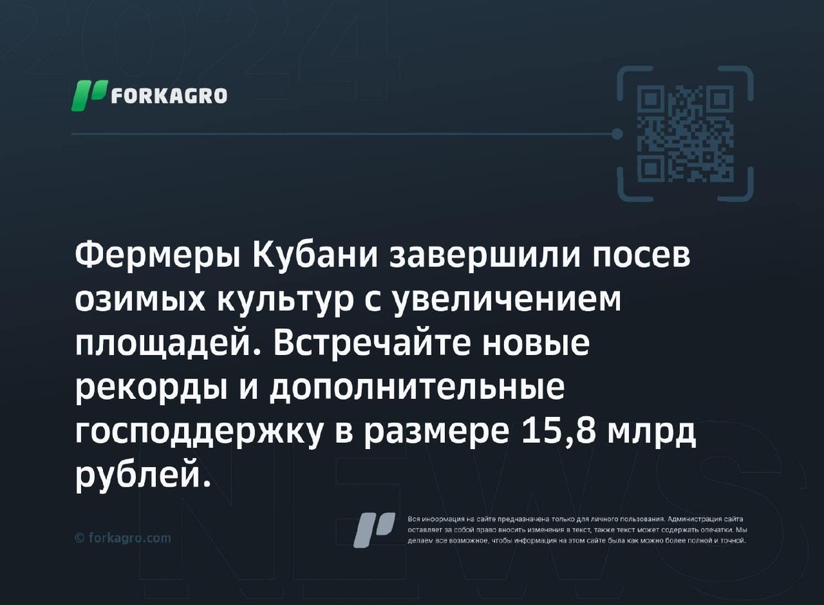 Фермеры Кубани завершили посев озимых культур с увеличением площадей. Встречайте новые рекорды и дополнительные господдержку в размере 15,8 млрд рублей. Фермеры Кубани завершили посев озимых культур, суммарная площадь посева составила 1,8 млн га. Посеяно: пшеницы - 1,6 млн га, ячменя - 178 тыс. га, рапса - 85 тыс. га. Несмотря на недостаток осадков, всходы хорошие. Уборочная кампания завершена. В 2021 собрано 11,2 млн т зерна, 980 тыс. т масличных культур, 830 тыс. т риса, 6,6 млн т сахарной свеклы, 1 млн т сахара. Объем поддержки агропромышленного комплекса в 2025 году - 15,8 млрд руб., включая субсидии и кредиты на общую сумму 611 млн руб. Перейти к источнику