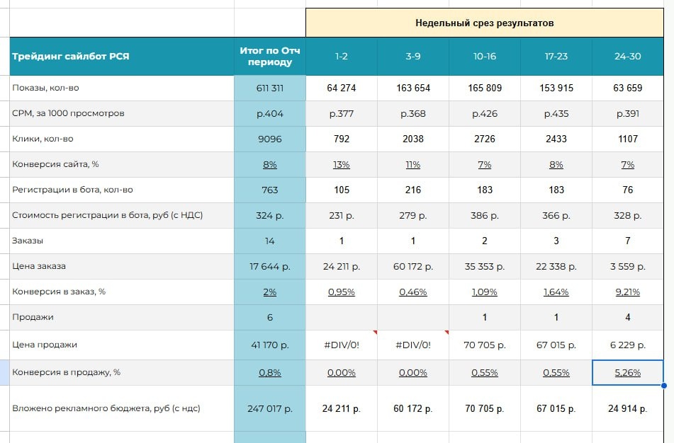 Наглядный пример, как трафик в РСЯ разгоняется, база набирается и в конце срока происходит сделка. Ниша экспертная, обучение трейдинг, можно даже сказать - повышение квалификации опытных трейдеров. Аудитория тяжелая, не все доверчиво относятся к обучениям, влияет синдром самозванца и множество мошенников в этой нише. Не смотря на все вышеперечисленные проблемы за ноябрь мы сделали 6 продаж курсов для трейдеров в связке с автоворонкой. Средняя конверсия в сделку за месяц = 0,8% 🔥А когда эксперт провел живой вебинар конверсия в сделку составила = 5,2% В таблице ответ тем, кто надеется на быстрые результаты через волшебные решения. Их нет. Если работать грамотно и заниматься только своей работой, (касается каждого этапа — трафик, воронка, продажа), то все непременно ваши вложенные инвестиции в трафик окупятся. Запустить окупаемый трафик → @safinfarit ☄️ Фарит | Трафик, лиды и клиенты