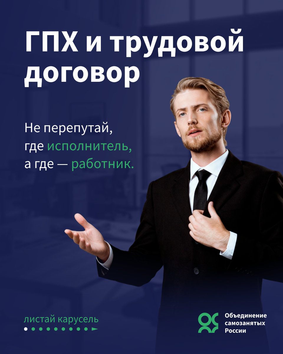 Вы решили открыть свое дело в статусе самозанятого, и вам понадобился помощник? Можно заключить с ним договор ГПХ. «Что говорить налоговой, если она будет считать это трудовыми отношениями?». Разбираемся в карточках. Но сначала — немного теории. Трудовой договор — это соглашение между работником и работодателем, в котором Трудовым кодексом четко определены: трудовая функция (то есть выполняемая работа), условия труда, права и обязанности сторон. Договоры ГПХ бывают нескольких видов. Чаще всего подразумевают договор подряда (или выполнения работ) и договор возмездного оказания услуг с физическим лицом. Главное отличие гражданско‑правового договора от трудового состоит в том, что он заключается на выполнение конкретной работы или оказание конкретной услуги, то есть, как правило, носит разовый характер. Отношения сторон такого договора регулирует Гражданский кодекс. Ставьте лайк и пишите комментарии, если было полезно. Подписывайтесь на наш телеграм-канал, чтобы знать всё о самозанятост