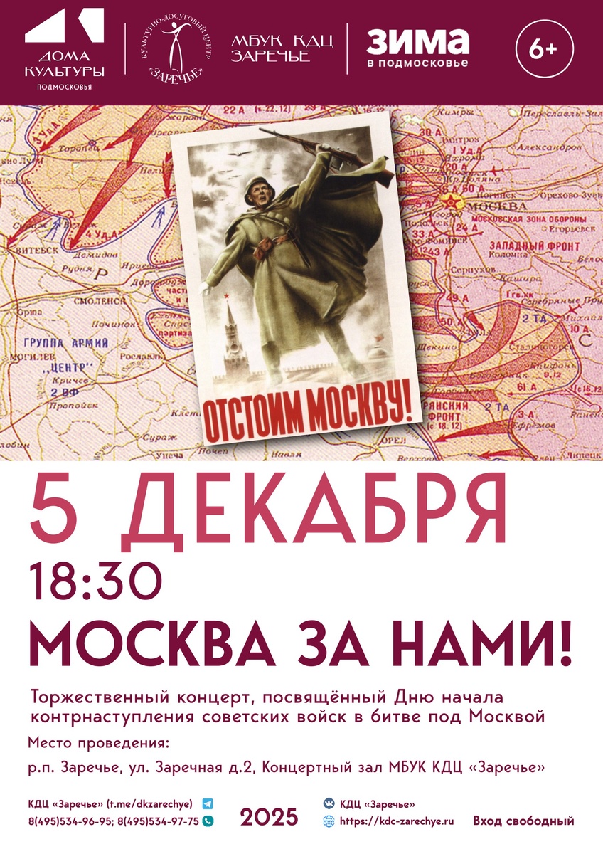 5 декабря (пятница) в 18:30 в большом концертном зале КДЦ "Заречье" состоится торжественный концерт, посвященный Дню начала контрнаступления советских войск против немецко-фашистских войск в битве под Москвой в 1941 году. Победа советских войск под Москвой и начало контрнаступления стали переломным моментом во Второй мировой и Великой Отечественной войнах. Раз и навсегда был развеян миф о непобедимости фашистской армии, а также возможности победы над СССР в "молниеносной войне". В концерте примут участие творческие коллективы культурно-досугового центра и приглашенные артисты. 🎶 #кдцзаречье #культура_одинцовский #культуравзаречье #культура #ОГО #культураОГО #концерт #ВОВ #пятоедекабря