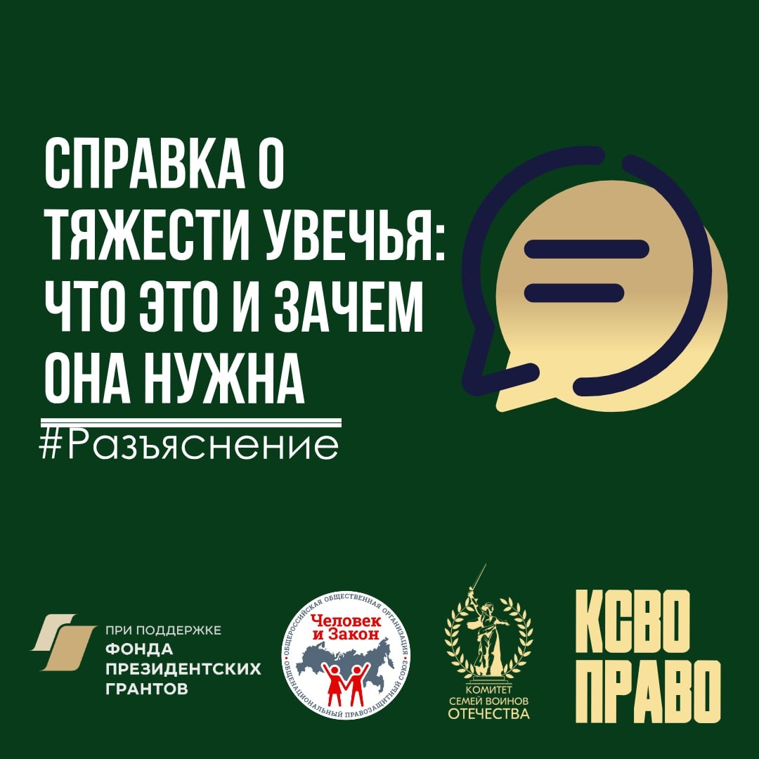 Правовая служба Комитета семей воинов Отечества (КСВО) запускает серию публикаций об актуальных формах документов, необходимых военнослужащим и их семьям при оформлении мер поддержки и том, что необходимо учесть при их оформлении, чтобы избежать проблем. Сегодня речь пойдет о справке о тяжести увечья. Справка о тяжести увечья — это медицинский документ, который подтверждает диагноз и степень тяжести полученного ранения/травмы/контузии (лёгкое или тяжёлое). Её выдаёт военно-врачебная комиссия (ВВК) после освидетельствования в военно-медицинской организации. Именно на основании этой справки страховая определяет размер положенной выплаты. Размеры выплат с 13 ноября 2024 года: 3 000 000 ₽ — при тяжёлом увечье (раздел I Перечня); 1 000 000 ₽ — при лёгком увечье (раздел II Перечня); 100 000 ₽ — если травма не входит в Перечень. (ПП РФ № 1534 от 13.11.2024, в исполнение Указа Президента РФ № 967.) Дополнительно: 4 000 000 ₽ — при установлении инвалидности вследствие ранения (идёт доплата до 4