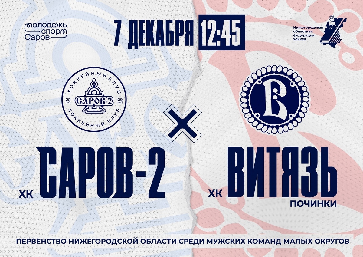 7 декабря в Ледовом дворце ХК «Саров-2» принимает одного из лидеров первенства Нижегородской области среди мужских команд малых округов — ХК «Витязь» из Починок.