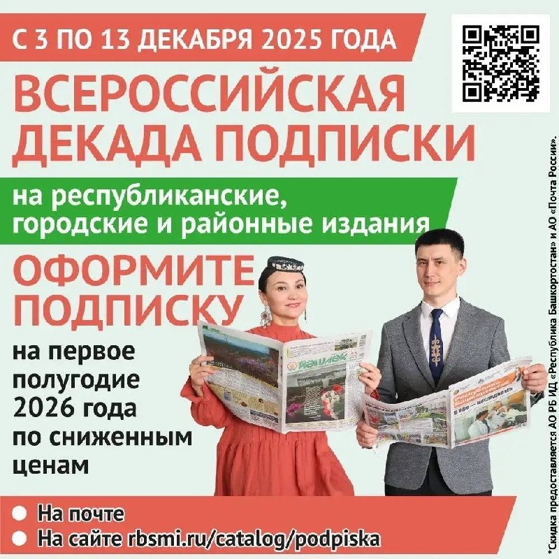 С 3 декабря в Башкирии стартовала декада льготной подписки До 13 декабря можно оформить подписку на первое полугодие 2026 года на любые газеты и журналы Издательского дома «Республика Башкортостан» по сниженной цене. По традиции, декада льготной подписки не обойдётся без розыгрыша полезных в хозяйстве призов. Его планируют провести уже в январе. Для участия — отправляйте копии подписных квитанций по адресу: 450079, г. Уфа, ул. 50-летия Октября, д. 13, 4-й этаж, или на электронную почту: gazrb@mail.ru. Телефоны для справок: 8 (347) 273-45-21, 273-47-52.