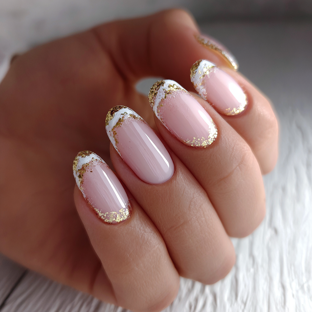 Полупрозрачная молочная база + глянцевый топ = чистый, аккуратный, “дорогой” вид. Подходит под любое платье и любую длину. Лёгкий золотистый шиммер в нюдовой базе.
