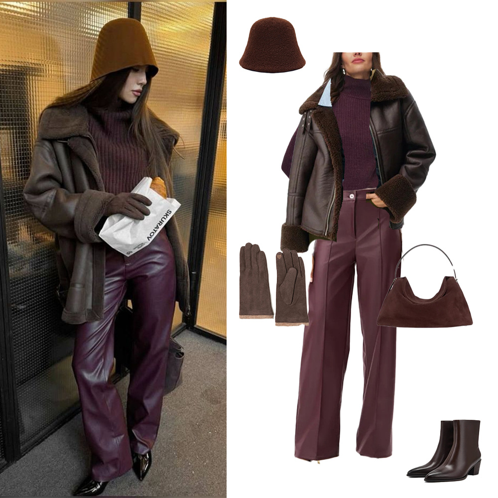 У меня поднакопились тёплые образы с Пинтерест с дубленками и шубами, аналоги которых мне захотелось собрать на Wildberries. Зима только началась - возможно, вы еще в растерянности, что носить или что добавить в гардероб, и какая - то из идей из этой подборки вам пригодится. Образ 1 Одно из самых модных сочетаний оттенков прошедшей осени - сливового и коричневого- остаются с нами и в зимнем сезоне. И это ну очень красиво, а здесь ещё и игра фактур: трикотаж, экокожа, замша. Я не удержалась и добавила ещё и букле в панаме- она все де теплее и интереснее, чем в исходнике. Дубленка 518617668 (или арт. SL5810011104 на сайте Sela) Брюки 555622277 - очень удобна экокожа в поясных изделиях на осень и зиму, особенно, когда дождь с грязью или слякоть. Свитер 250645617 - базовый и теплый. Ботильоны 533097499 (еще похожие 500123849) - тёплые стильные и элегантные. Сумка 325141807 - очень классная форма. Панама 600935140 Перчатки 504436164 Образ 2 Здесь кофейные оттенки с ярким красным акценто