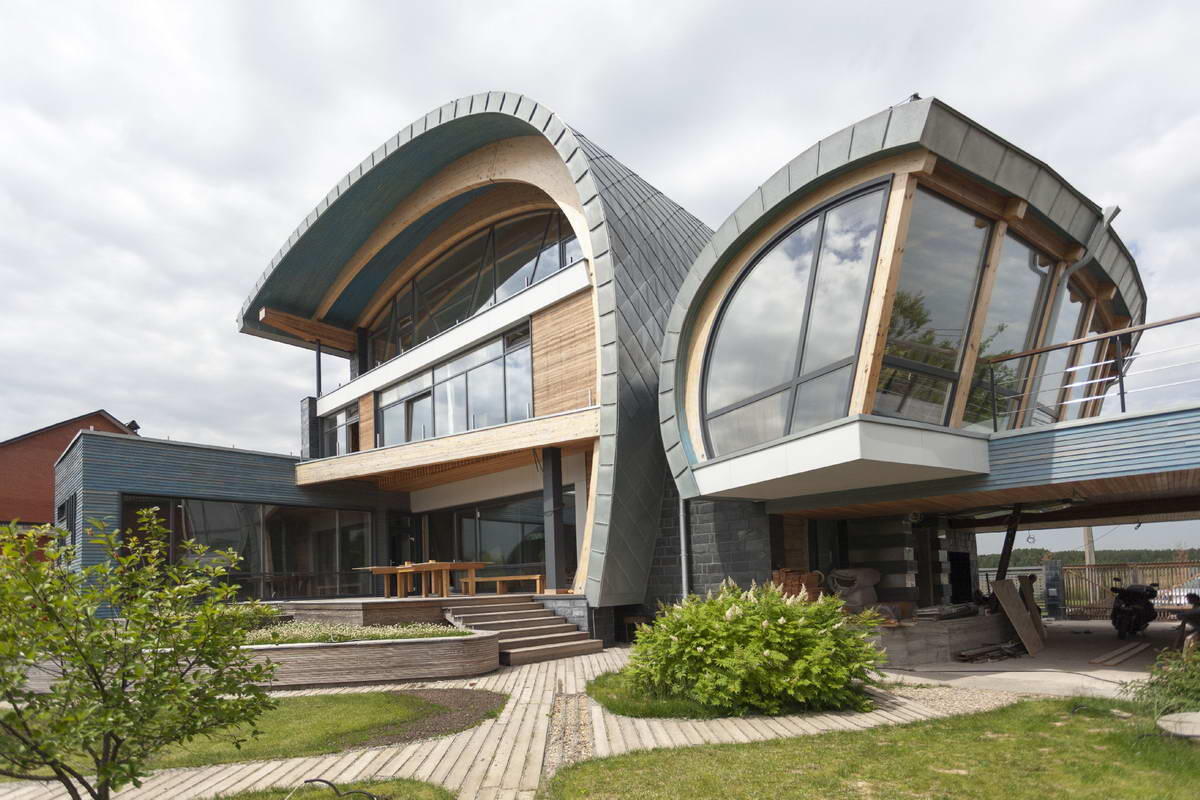 Это маленькая часть нашей уникальной коллекции, в которой сейчас более 8000 лучших домов со всего мира. В выборе нет никакой закономерности - проекты отобраны случайно. *** 1. Загородный дом в Подмосковье 9 Роману Леонидову достался готовый, но не расположенный к нагрузкам фундамент и смелый заказчик, не чуждый экспериментов творческий человек, – в результате получился дом, которому и название-то сложно придумать. Дом-икс. Дом в небольшом поселке вблизи Пироговского водохранилища, в живописном окружении: с одной стороны лес, с другой вода, – как это нередко бывает, достался бюро Леонидова построенным до цоколя по предшествующему проекту, – его план, и даже отчасти габариты и пропорции были определены. Но хозяева, люди творческие, активные и разносторонние, противники статики и симметрии, мечтали о необычном доме и попросили архитектора придумать что-то новое, непохожее на соседние коттеджи. Окружающая природа также, по словам Романа Леонидова, подталкивала к поиску нетипичной, фут