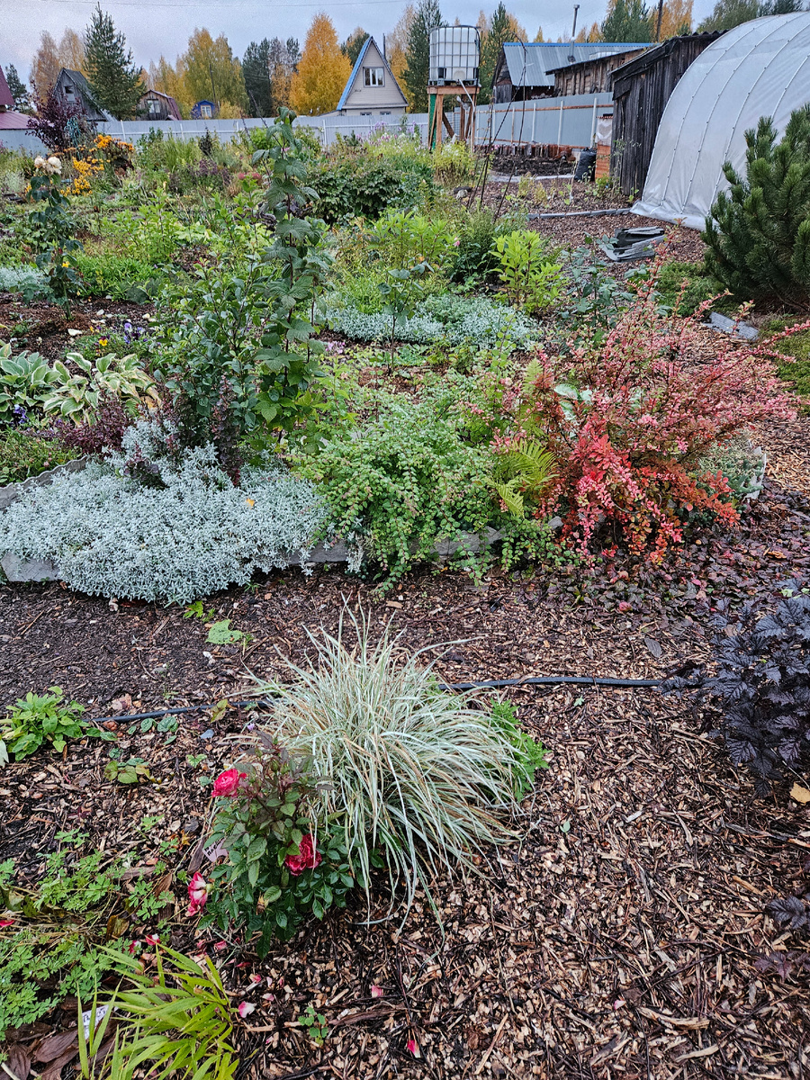 Если приглядеться к небесным далям, то серость, хмурость и облачность будут почти постоянными спутниками короткого северного лета. Оттого и ценен каждый кадр, где необъятная синь неба вступает в контраст с изумрудными кочками овсянницы. Ступаю на дорожку из картона и мульчи, она мягко пружинит, хотя и утоптана бесконечной ходьбой. Обновляется ежегодно, по мере поступления картона и мульчи. Стоит осоту проявить себя в упорном ростке, как сразу ему на погибель накидываются листы картона и засыпаются мульчёй. Из всех видов мульчи больше всего прикипела душой к берёзовой, к колечкам из кусочков бересты. И вид симпатичный, и структура рыхлая, и гниёт, оказывается, медленно. Помнится, делала я дорожку из пеньков берёзовых. Сердцевины пеньков сгнили за четыре года в труху, а береста осталась нетронутой, даже цвет не поменяла. Создала сама себе проблему из этих пеньков: круг из бересты есть, а внутри труха. Ступаешь и проваливаешься. Нужно менять, а куда бересту девать, если в бочке не жг