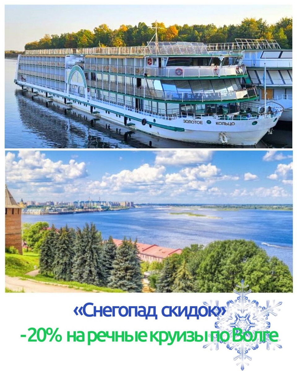 ❄️ Cнегопад скидок: -20% на речные круизы по Волге Зима заставляет нас не только готовиться к Новому году, но и с ностальгией и некоторой грустью вспоминать о теплом весеннем ветре и летних вечерах. Начните планировать отдых на майские праздники и лето уже сейчас: вы получите массу приятных эмоций от предвкушения прекрасного путешествия и выгоду от зимних скидок. Например, скидку 20% на ваш речной круиз по Волге. 🔥 Скидка 20% на выборочные круизы по Волге сезона 2026 года действует до 28.12.25. Отправление теплоходов из Москвы, Ярославля, Нижнего Новгорода, Казани и других городов России. Рекомендуем круизы на майские праздники: ▶️ Круиз из Нижнего Новгорода с посещением Казани на теплоходе “Алдан” Даты: 01 - 05.05.26 на 4 н./ 5 дн. Маршрут: Нижний Новгород - Макарьево - Чебоксары - Казань - Тетюши - Казань - Чебоксары - Козьмодемьянск - Нижний Новгород. Стоимость: от 32 700 руб/ чел (без учета скидки по акции) ▶️ Круиз из Москвы с посещением Твери и Калязина на теплоходе “Аурум