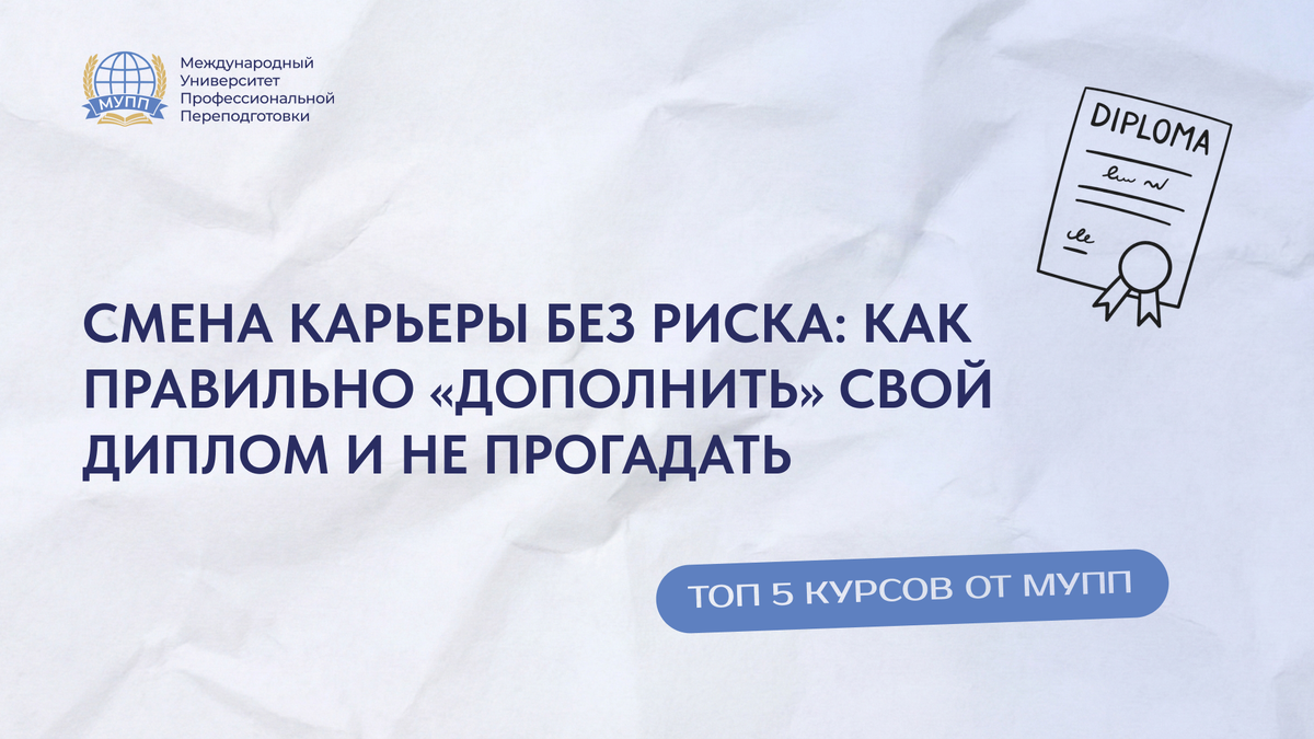 Устали от рутины, низкой зарплаты и ощущения, что застряли на месте? Хотите новую профессию, но не знаете, с чего начать? Эксперты Международного Университета Профессиональной Переподготовки расскажут, как сделать шаг к переменам. Сменить карьеру — не значит начинать всё с нуля. Достаточно подтвердить новые компетенции официальным документом — дипломом о профессиональной переподготовке. Что он даёт: - вы можете работать по новой специальности; - смело увеличиваете стоимость своих услуг; - получаете доверие работодателей. Многие боятся менять профессию, так как думают, что для этого нужно снова идти в вуз на несколько лет. Но это миф. Существуют программы, которые проходят дистанционно и укладываются в 3–6 месяцев. За это время вы получаете всю необходимую теорию, отрабатываете практические навыки и получаете документ государственного образца. Главное, выбрать перспективное направление, которое востребовано здесь и сейчас. Присмотритесь к рынку. Какие профессии растут быстрее других? Гд