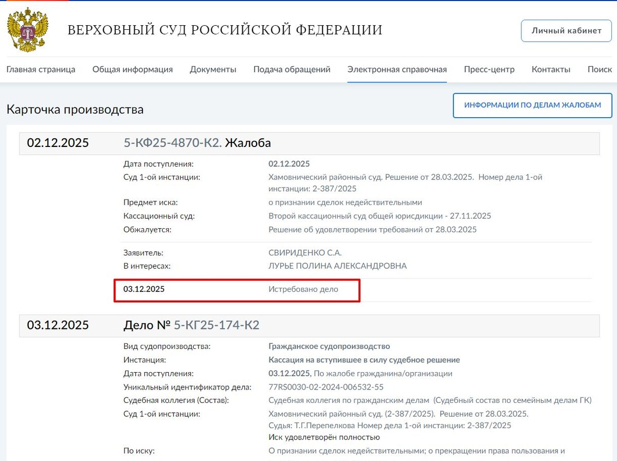 ❗️ Верховный Суд истребовал дело по жалобе Полины Лурье против Ларисы Долиной