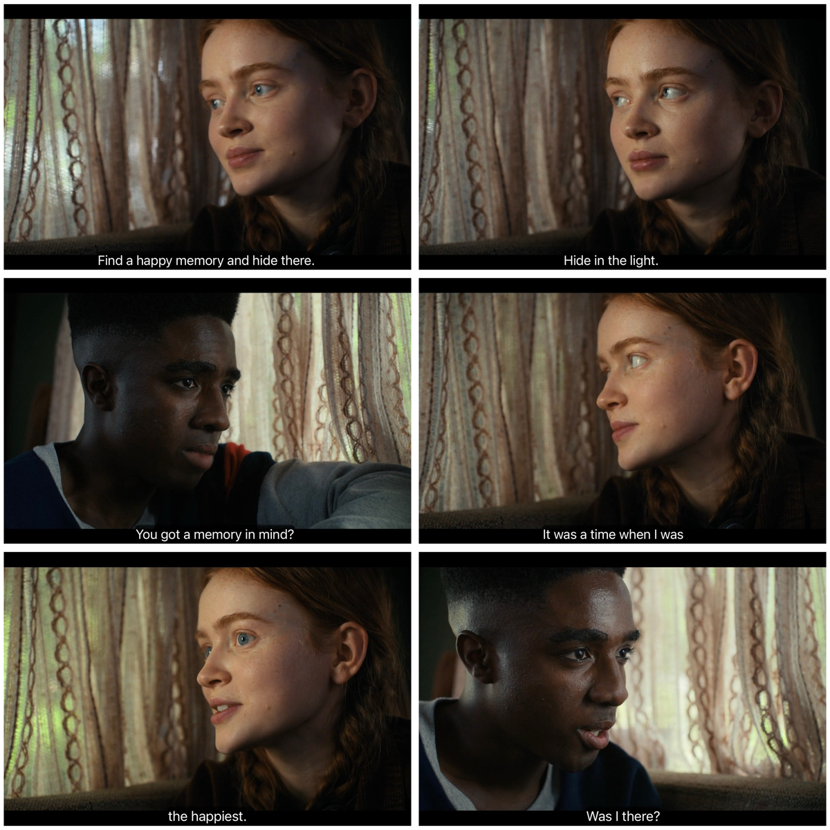 Пересмотрев последний сезон, я особенно обратил внимание на параллели в отношениях Лукаса/Макса и Стива/Нэнси, которые выходили далеко за рамки их поверхностного сходства. В 4 сезоне Максу удаётся скрыться от Векны, «спрятавшись на свету», то есть цепляясь за счастливые воспоминания, как за маяки надежды во тьме. Как ни странно, распавшиеся пары Люмакс и Стэнси мирятся и переживают самые нежные и тёплые моменты утешения в самый, без сомнения, тёмный период сериала (в отличие от разногласий в семье Джейнси, которые только усугубляются средь бела дня, ещё до того, как наступил весь этот хаос). Пока Лукас и Макс строят планы на свидание в зловещем, полуразрушенном доме убийц Векны, Стив и Нэнси обсуждают светлые мечты о будущем, путешествуя по кошмарному аду Изнанки. Даже столкнувшись с потенциальным концом света, обе пары всё же решают найти свет во тьме и дать себе надежду после всех этих смертей и разрушений. Тематически это подчёркивает важность сохранения этих маленьких островков радости и надежды в борьбе с надвигающимся чувством обреченности – невысказанного обещания, что жизнь продолжится и что по ту сторону этого кошмара их ждёт счастье. [См. «Огонь и дождь» Джеймса Тейлора («Я видел огонь и дождь… Но я всегда думал, что увижу тебя снова »)]