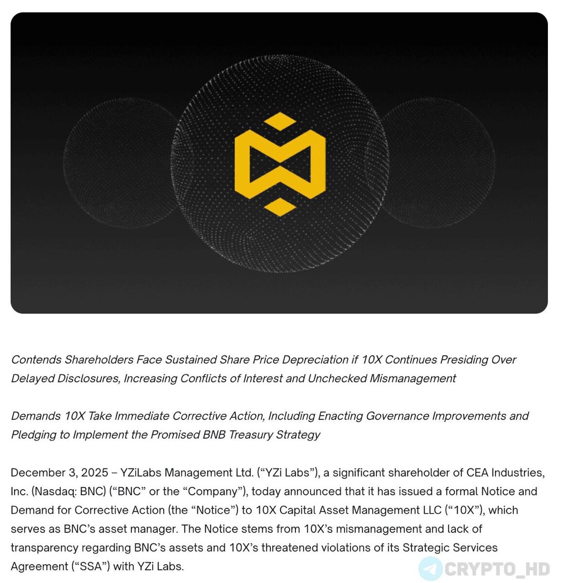 🥊 #BNB Скандал в YZi Labs, 10X Capital и BNC… ➤ Летом YZi Labs и 10X Capital переформатировали стратегию компании CEA Industries и инициировали ребрендинг в BNB Network Company (BNC). ➤ Сегодня фонд YZi Labs направил официальное требование 10X Capital (управляет активами BNC) и предупредила акционеров BNC о рисках от действий управляющего. ➤ 10X Capital якобы угрожает отказаться от BNB-стратегии и переключить капитал BNC на другие активы, включая Solana (#SOL). ➤ Это противоречит соглашениям и публичным заявлениям, под которые летом привлекли более $500,000,000 для покупки BNB. ➤ Компания 10X Capital уже допустила задержки раскрытия базовых данных по активам и создала конфликты интересов на уровне совета директоров. ➤ Из за совокупности просчетов акции BNC сильно обвалились (-87% от пиковых значений). ➤ Для сравнения: акции BitMine (компании из того же сектора) после своей летней новости об инвестициях в #ETH выросли на 667% и до сих пор держатся почти на тех же уровнях ➤ YZi