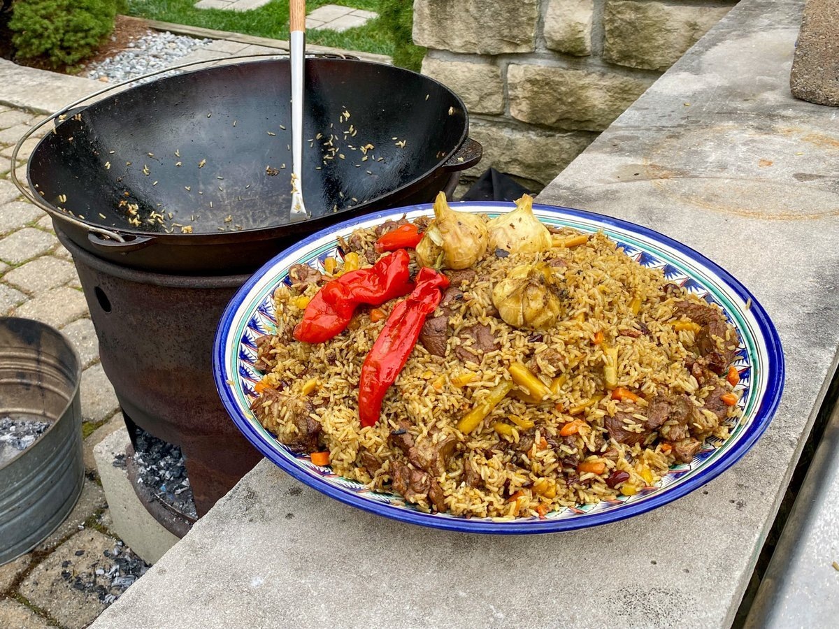 Ловите рецепт👇 (можно и на плите) • Рис 800гр (Басмати) • Мясо - 1 кг. • Масло растительное - 200 гр. • Лук - 3/4 шт. • Чеснок - 1 головка • Морковь - 2 шт. • Перец красный острый - 1 шт. • Соль • Смесь специй для плова Рис замочить в воде комнатной температуры. Масло раскалить и хорошо обжарить одну целую головку лука, после удалить ее и добавить остальной нарезанный лук полукольцами и обжарить до золотистого цвета. Далее в лук выложить мясо и обжарить до золотистого цвета. Добавляем морковь - обжариваем до мягкости. Залить все кипятком, добавить чеснок, красный перец, специи для плова и соль,убираем на медленный огонь и варим 40-60 мин. Рис промываем до прозрачности воды, аккуратно засыпаем в мясо (не перемешивать), если нужна будет вода, то добовляем кипяток. Вода должна покрывать рис на 1 см. Ставим на максимальный огонь и варим до испарения воды делая проколы. Когда вода выпарилась и осталось одно масло убираем с огня, из риса делаем горку, накрываем ее тарелкой, с верху выклад