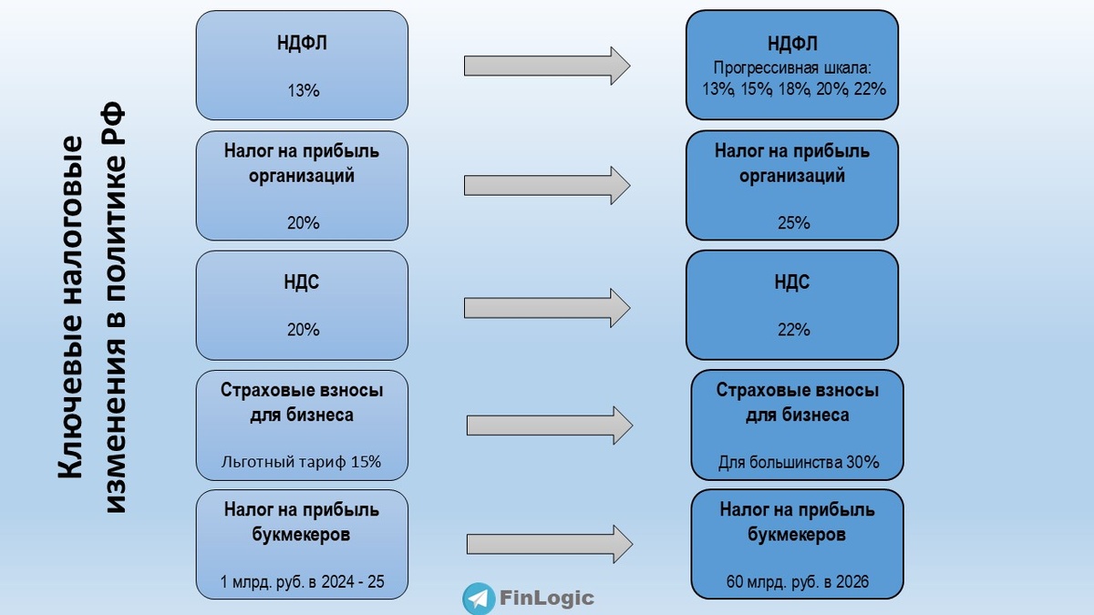 По итогам 2024 года дефицит бюджета РФ составил 3,485 трлн рублей, а в 2025 дефицит планируется на уровне аж 5,7 трлн рублей, а это рост почти на 64%. И что же делать? Одним из самых заметных и массовых решений стало увеличение налогообложения россиян и это не удивительно, такое мероприятие может стать наиболее эффективным в текущих реалиях. Давайте подробнее разберемся что и где увеличили: 1️⃣НДФЛ Введена 5-ступенчатая прогрессивная шкала: 13%, 15%, 18%, 20%, 22% в зависимости от годового дохода. Об этом мы уже писали тут. 2️⃣Налог на прибыль организаций Базовая ставка повышена с 20% до 25%. 3️⃣НДС (налог на добавленную стоимость) Уже сейчас для бизнеса на УСН (упрощенная система налогообложения) введена обязанность платить НДС при доходе свыше 60 млн руб, далее порог для УСН начнёт поэтапно снижаться до 10 млн руб в 2028. А с 1 января 2026 году общая ставка НДС повышается с 20% до 22%. 4️⃣Страховые взносы для бизнеса Большинство субъектов малого и среднего бизнеса потеряют пра