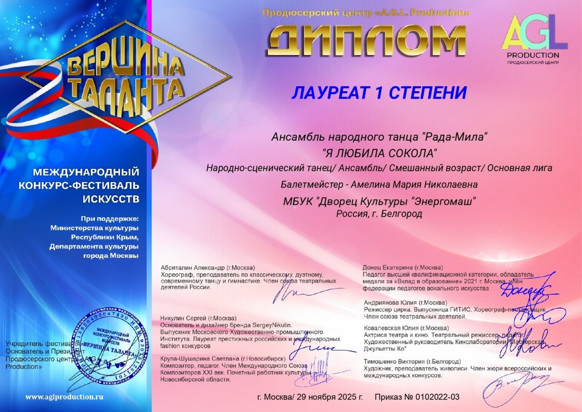 Ансамбль народного танца «Рада мила» Дворца культуры «Энергомаш» - обладатель ГРАН-ПРИ и лауреат I степени Международного фестиваля-конкурса искусств «Вершина таланта! 🍁 Хореографические постановки ансамбля произвели огромное впечатления на членов жюри: 🏆 «На горе-то мак» — удостоен высшей награды фестиваля — ГРАН-ПРИ! 🥇 «Я любила Сокола» — признан Лауреатом I степени! Это не просто победы — это триумф искренности, мастерства, душевной силы и глубокой связи с народной культурой. Каждое движение, каждый костюм, каждый взгляд на сцене — результат огромной работы, любви к традициям и уважения к зрителю.