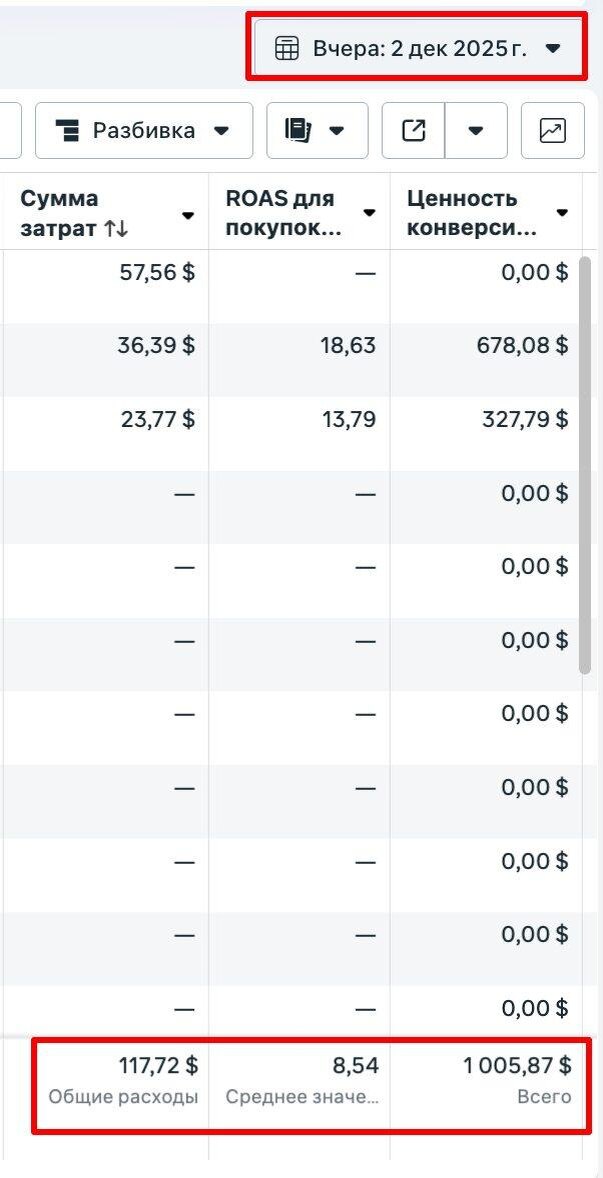 🎄 8,54 ROAS под ёлочку Вчерашний день. Расходы - $117 Выручка - $1 005 И это всего за сутки работы рекламы для интернет-магазина в ОАЭ. Праздник к нам приходит Новый Год уже зашел - и сразу с прибылью. Кому еще настроить такой подарок? 🎁