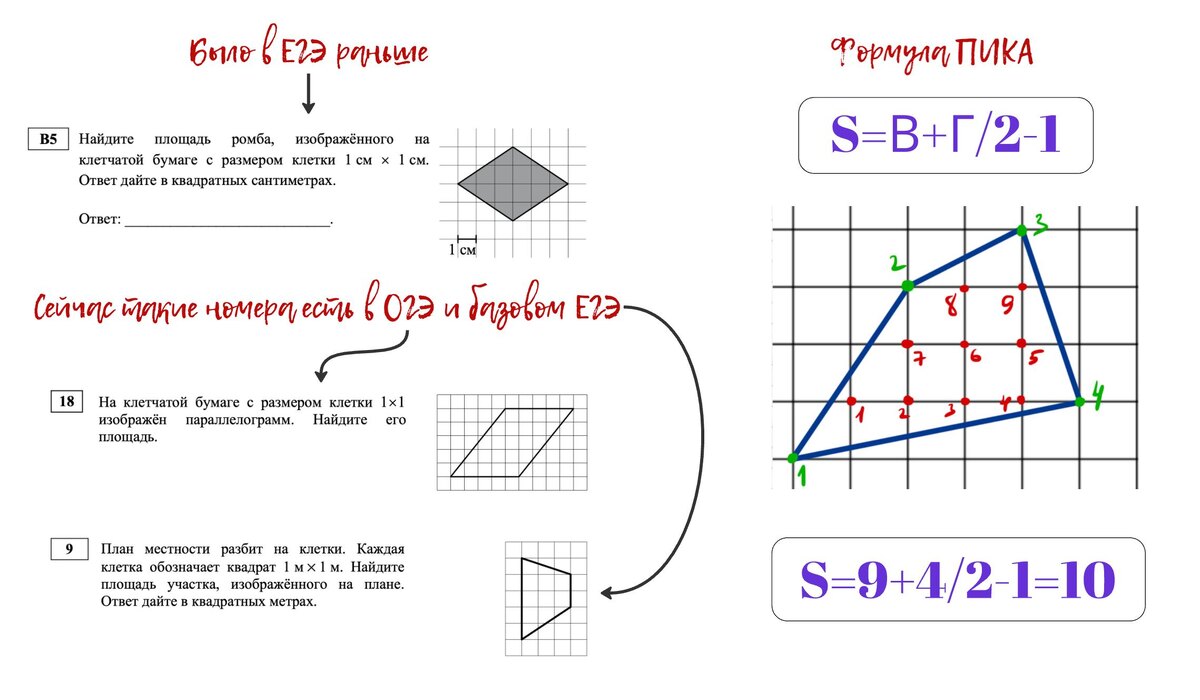 👀Раньше в ЕГЭ был номер на нахождение площади многоугольника, изображенного на клетчатой бумаге. - И это был один из самых простых номеров, т.к. Можно вообще не знать как вычисляются площади параллелограмма, ромба, треугольника или трапеции, ведь тут была универсальная формула Пика‼️, позволяющая находить площадь любого многоугольника, изображенного на клетчатой бумаге. ✔️ Сейчас аналогичные номера встречаются только в ОГЭ по математике и в базовом ЕГЭ.