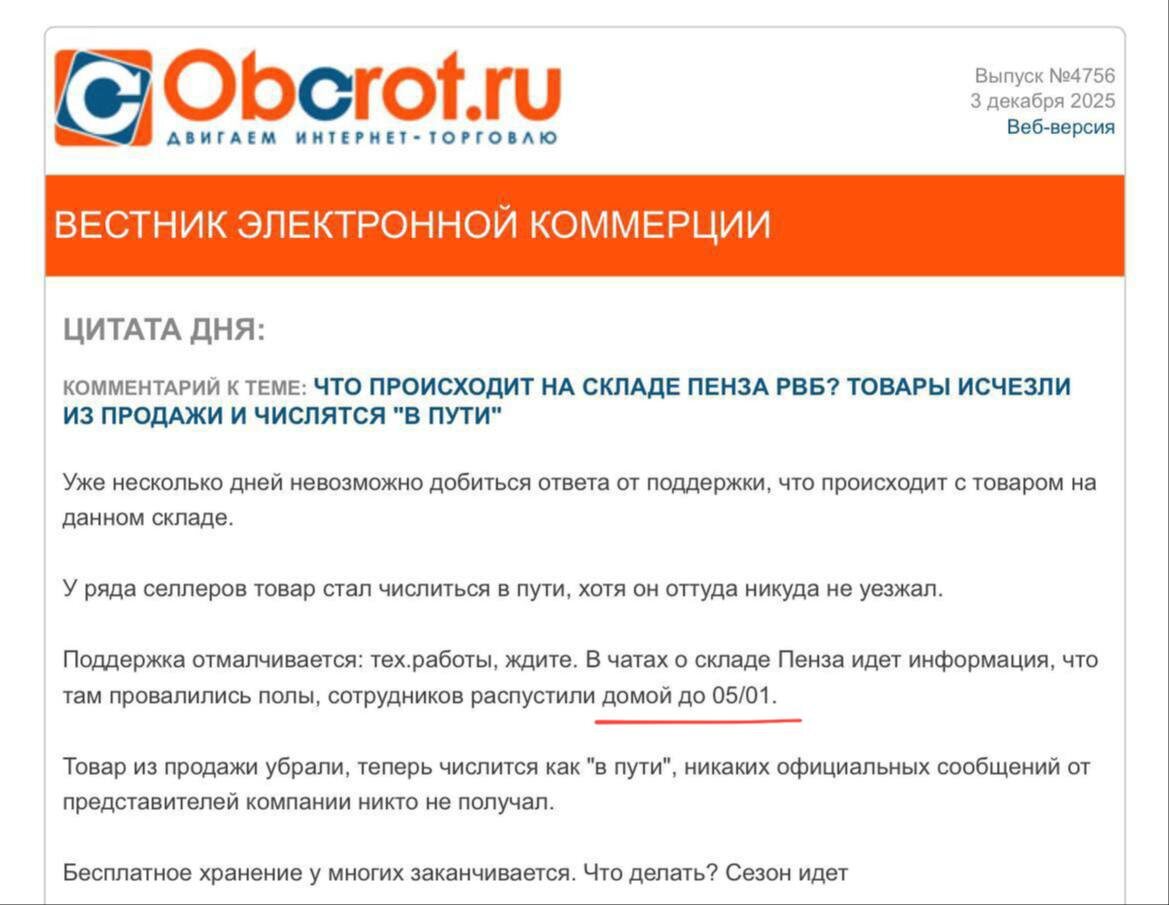 ⬜️ Склад ВБ в Пензе: На складе Пенза 28/11 весь товар из продажи перешел в статус в пути. Поддержка отвечает отписками, полный игнор. Индекс локализации растет, продаж нет, что с товаром не ясно, а сезон идет. Кто что знает? Из предложки.