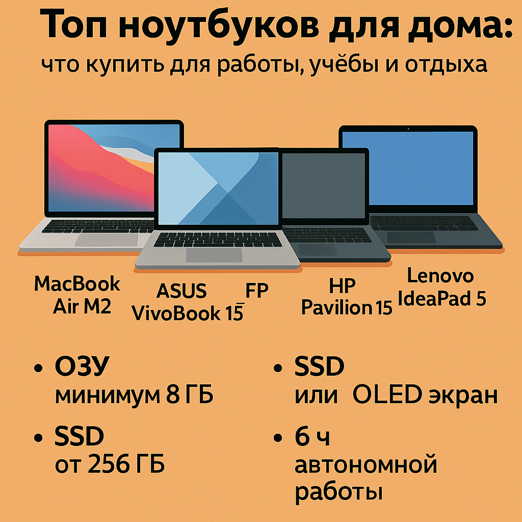 Иначе ноутбук теряет смысл мобильности. Лучшие ноутбуки для дома 1. MacBook Air M2 Самый тихий, самый автономный, самый стабильный. 2. ASUS VivoBook 15 Отличное сочетание цены и скорости. 3. HP Pavilion 15 Надёжный и сбалансированный, без перегрева. 4. Lenovo IdeaPad 5 Хорошая ма