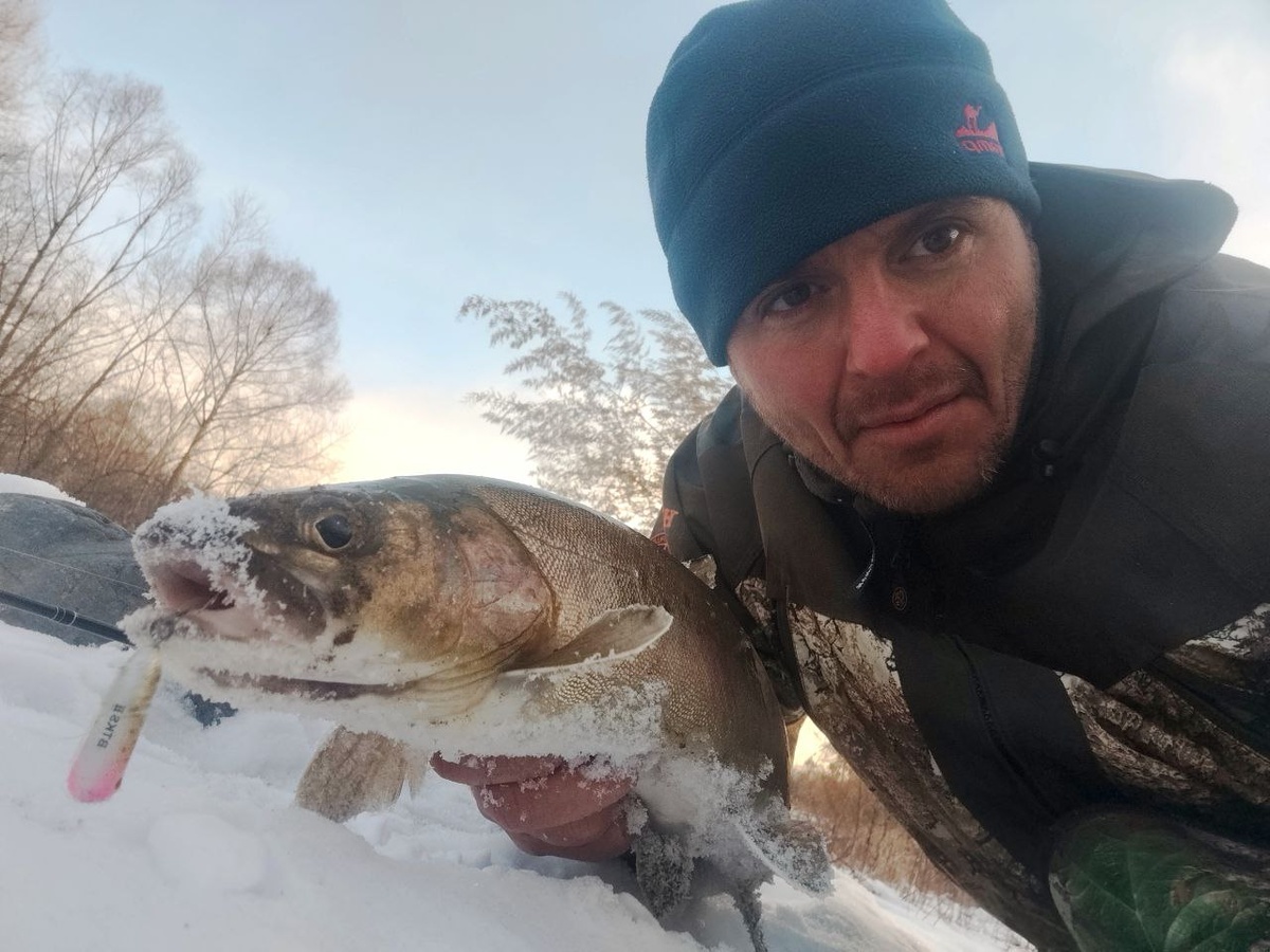 Мороз и сильный ветер сделали своё дело. Несколько дней назад по реке встречались лишь небольшие забереги. Сегодня почти всё русло сковано льдом. Условия для рыбалки сложные, но размерный ряд очень впечатлил.
